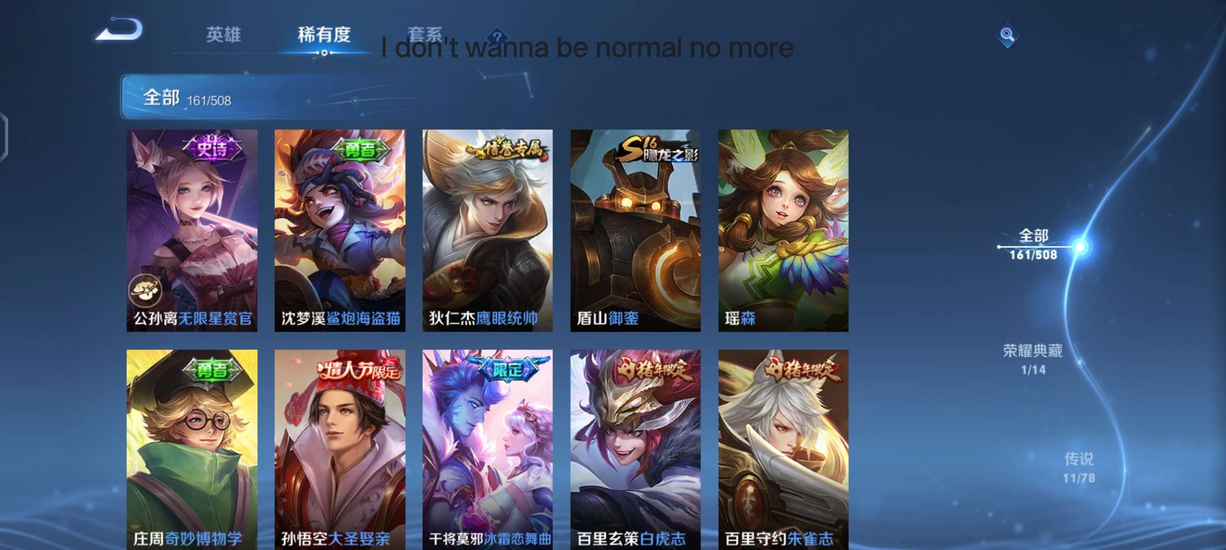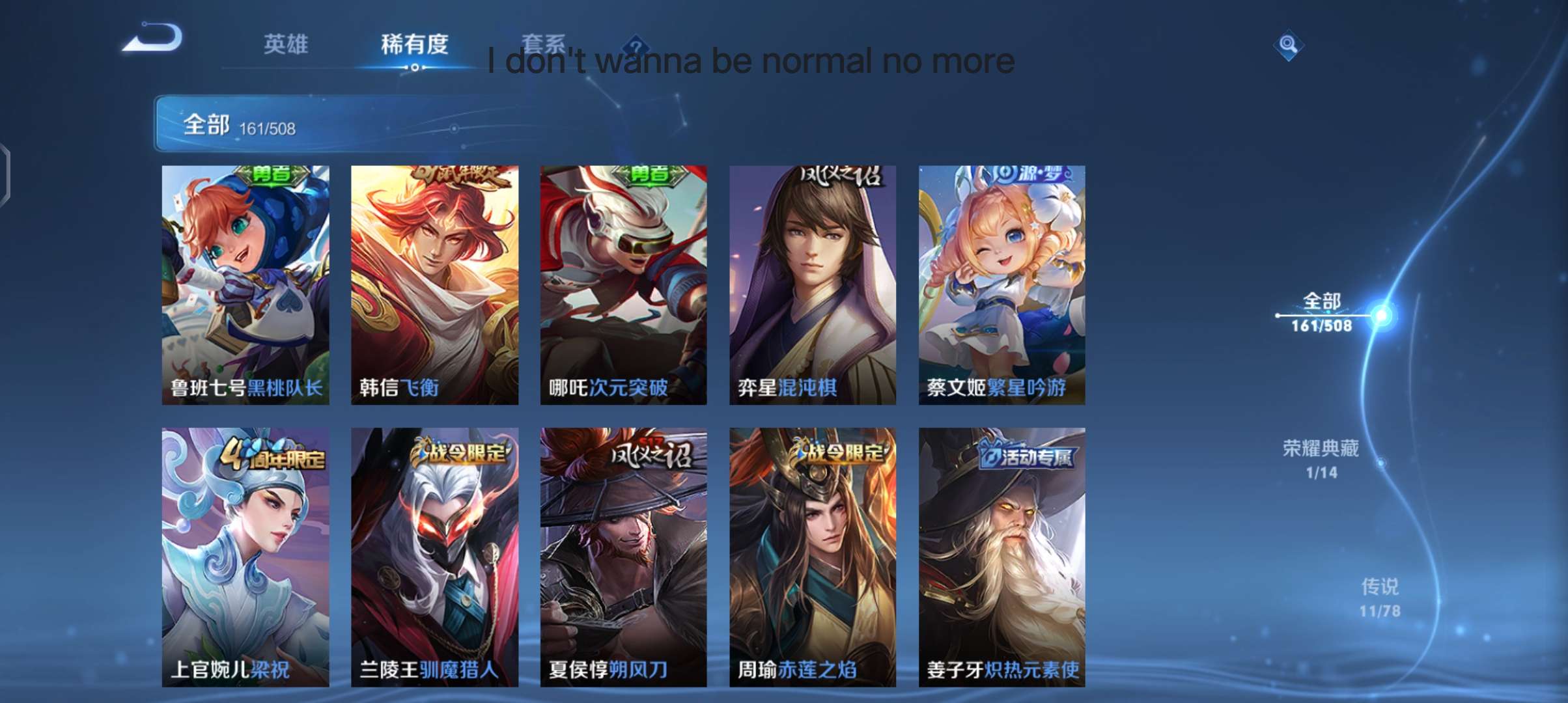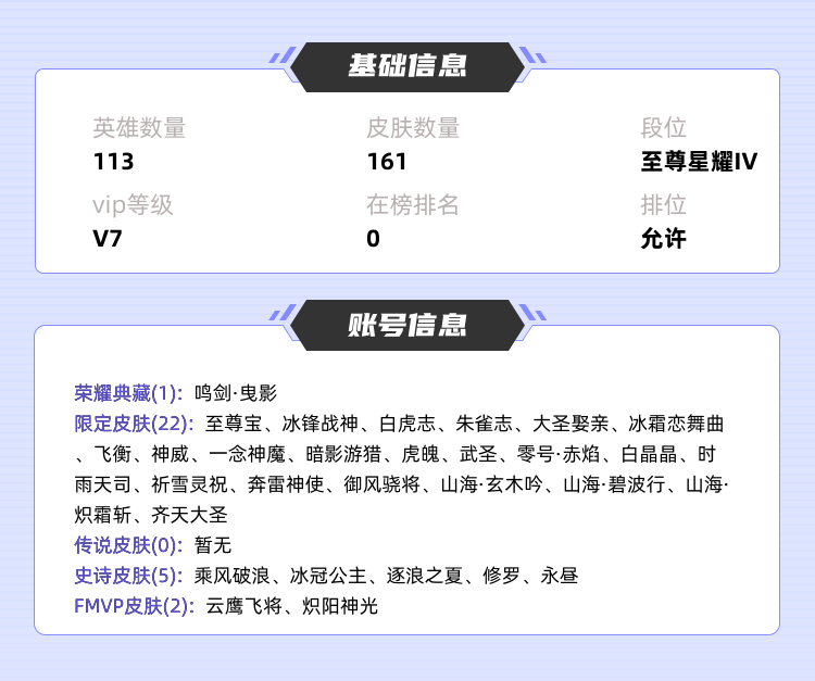 >>>>>>毁号,涉及毁坏虚拟财产罪及计算机安全罪,请文明游戏素质游戏,让我们共建美好租号平台> 本游戏账号: 英雄多,皮肤多。典藏皮肤1个,感受典藏皮肤带来的优质体验快感,FMVP皮肤2个,尽情享受FMVP皮肤带来的主角光环, 私人所属英雄皮肤有:李白 鸣剑·曳影曜 云鹰飞将||镜 炽阳神光百里守约 朱雀志||百里玄策 白虎志||干将莫邪 冰霜恋舞曲||公孙离 祈雪灵祝||关羽 冰锋战神||关羽 武圣||韩信 飞衡||吕布 御风骁将||马可波罗 暗影游猎||马可波罗 山海·玄木吟||芈月 白晶晶||牛魔 奔雷神使||孙悟空 至尊宝||孙悟空 大圣娶亲||孙悟空 零号·赤焰||孙悟空 齐天大圣||张飞 虎魄||诸葛亮 时雨天司||李信 一念神魔||李信 山海·炽霜斩||瑶 山海·碧波行||马超 神威,等等 注意事项: A.游戏过程中请不要恶意挂机或者不文明发言;B.恶意挂机、顶号等行为将被拉黑无法再次下单;C.进入游戏后中途请勿退出登陆,否则无法再次上号;D.部分账号由于异地登录可能会出现密码错误提示,通常再尝试5-6次后可上号。 >喜欢本账号请点 ☆收藏☆ 方便下次租用,谢谢光临惠顾