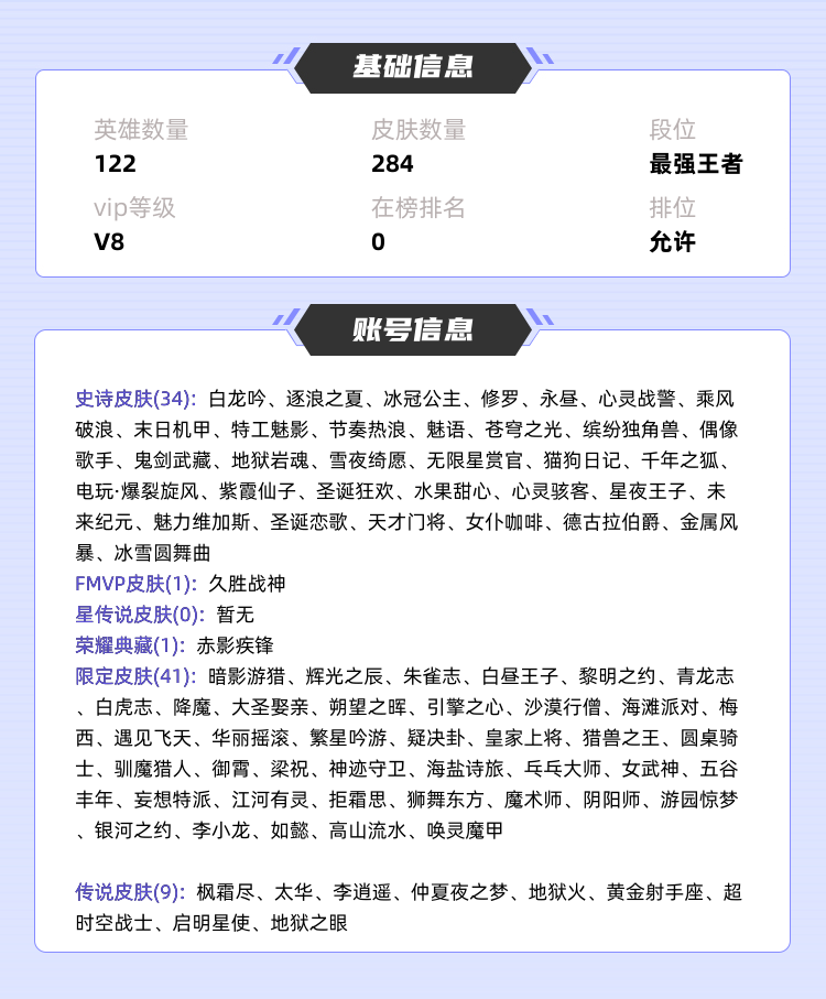 >>>>>>毁号,涉及毁坏虚拟财产罪及计算机安全罪,请文明游戏素质游戏,让我们共建美好租号平台>>>>>> 本游戏账号: ,英雄多,皮肤多。典藏皮肤1个,感受典藏皮肤带来的优质体验快感,FMVP皮肤1个,尽情享受FMVP皮肤带来的主角光环, 私人所属英雄皮肤有:关羽 赤影疾锋孙悟空 地狱火||狄仁杰 超时空战士||后羿 黄金射手座||虞姬 启明星使||貂蝉 仲夏夜之梦||曜 李逍遥||橘右京 枫霜尽||伽罗 太华||宫本武藏 地狱之眼,等等 注意事项: A.游戏过程中请不要恶意挂机或者不文明发言;B.恶意挂机、顶号等行为将被拉黑无法再次下单;C.进入游戏后中途请勿退出登陆,否则无法再次上号;D.部分账号由于异地登录可能会出现密码错误提示,通常再尝试5-6次后可上号。 |||||||||>喜欢本账号请点 ☆收藏☆ 方便下次租用,谢谢光临惠顾|||||||||