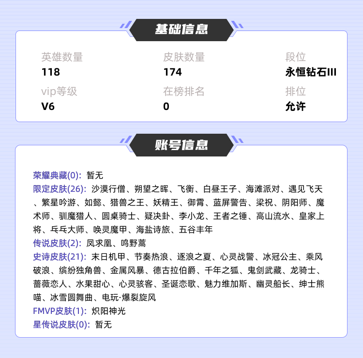 >>>>>>毁号,涉及毁坏虚拟财产罪及计算机安全罪,请文明游戏素质游戏,让我们共建美好租号平台>>>>>> 本游戏账号: ,英雄多,皮肤多。FMVP皮肤1个,尽情享受FMVP皮肤带来的主角光环, 私人所属英雄皮肤有:镜 炽阳神光女娲 朔望之晖||嬴政 白昼王子||李白 凤求凰||达摩 沙漠行僧||韩信 飞衡亚瑟 心灵战警||刘禅 电玩·爆裂旋风||夏侯惇 乘风破浪||宫本武藏 鬼剑武藏||李元芳 逐浪之夏||貂蝉 圣诞恋歌||阿轲 节奏热浪||雅典娜 冰冠公主,等等 注意事项: A.游戏过程中请不要恶意挂机或者不文明发言;B.恶意挂机、顶号等行为将被拉黑无法再次下单;C.进入游戏后中途请勿退出登陆,否则无法再次上号;D.部分账号由于异地登录可能会出现密码错误提示,通常再尝试5-6次后可上号。 |||||||||>喜欢本账号请点 ☆收藏☆ 方便下次租用,谢谢光临惠顾|||||||||