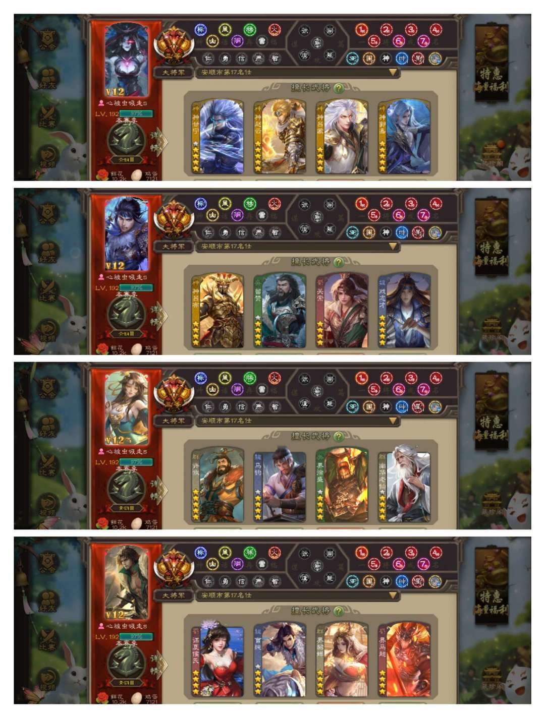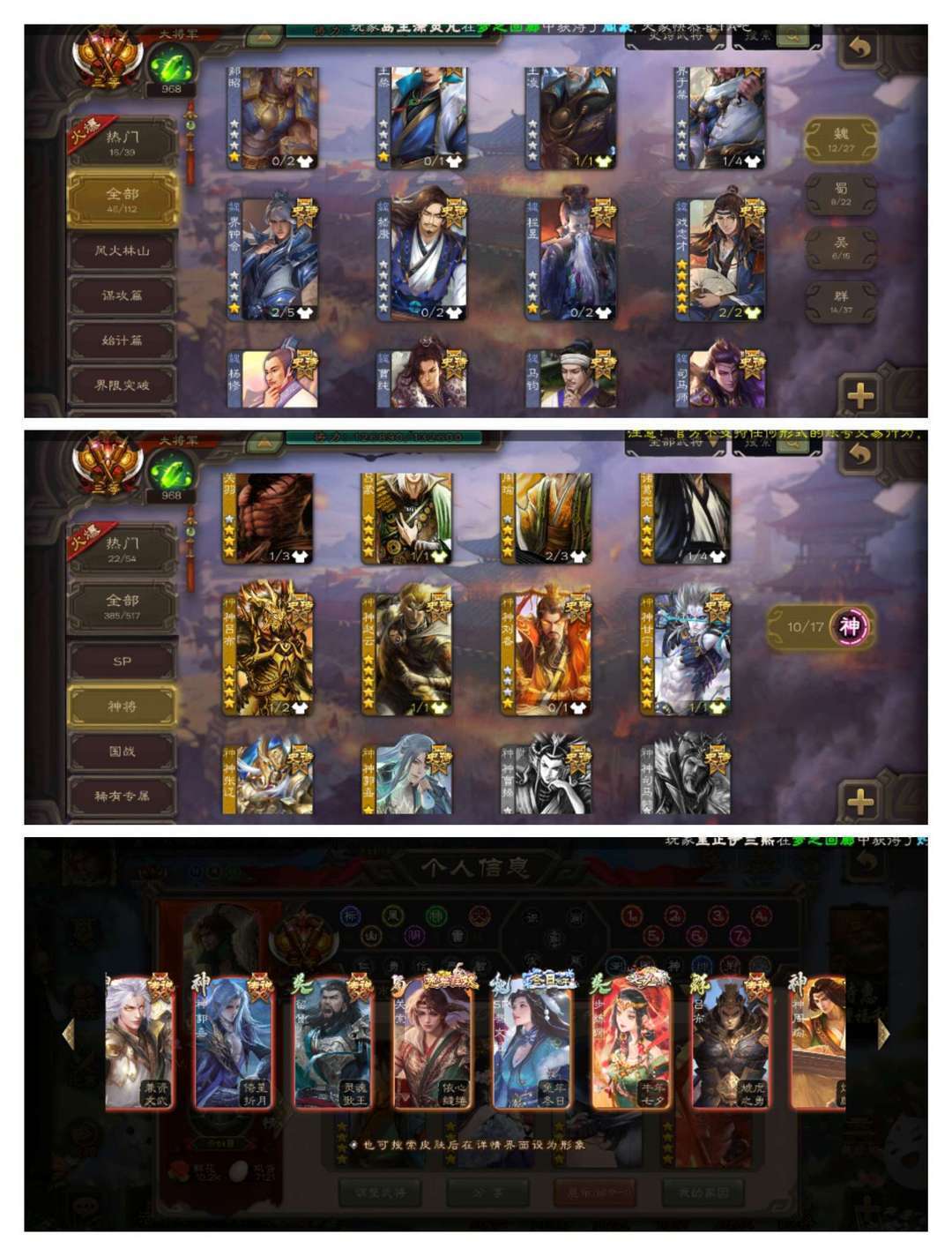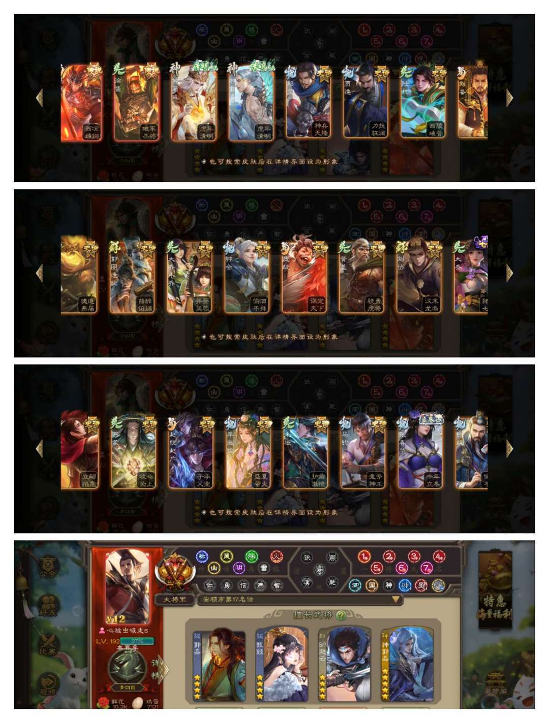 官方三等大将军,有卡,VIP12! 4五星炎龙:回廊双形态动神郭嘉,动神赵云动戏志才动许攸! 15四星玉龙:回廊动界徐盛,动神甘宁动留赞动神吕布动关索动曹纯,金马钧,谋夏侯氏南华老仙! 46史诗武将,手办动小乔,动卑弥呼,星甘宁界钟会周处周群等! 47动皮83金皮165国战皮肤!