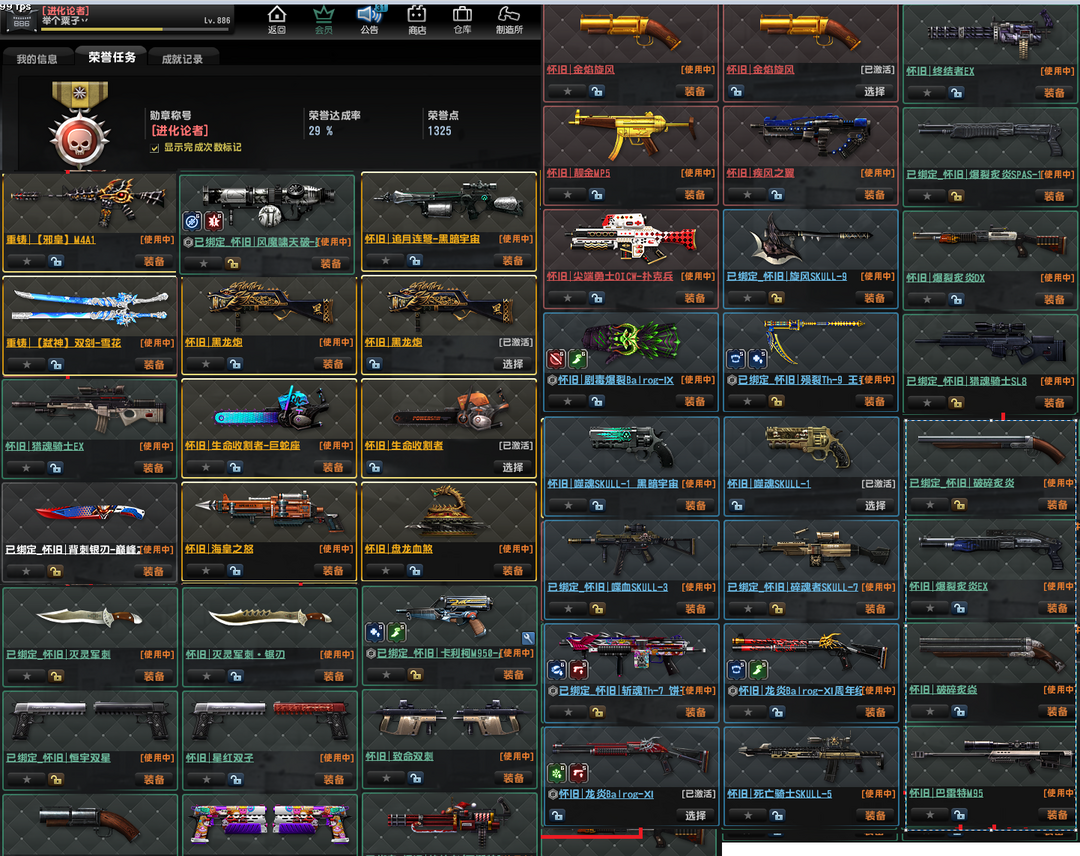 已经去黑雾、 重铸:弑神双剑,圣,邪皇, 怀旧 稀有: 闪电系列: 赛季悬赏: 3-24赛季悬赏(3夏日5燧发枪6绿野7朋克8魔咒9巨龙10蒸汽11恐龙12奇幻13星战14遗迹15超械16奇境17沙漠18超能19冰海20太空21饼干) 强化怀旧武器:猎魂骑士ex,灭灵军刺,锯刃,星红双子,金红双蝎,致命双刺,破碎炙焱,爆裂炙炎ex,爆裂炙炎dx,终结者ex, 怀旧,黑龙炮,盘龙血煞,海皇之怒,生命收割者电锯,旋风斧头斧子,圣诞毁灭者,圣诞终结者,荒漠金鹰,殒裂,卡利柯+8,风魔啸天破, 合金,超兽, 原石套,圣诞套,沙尘MG3,尤利乌斯+6,玩具先锋+5,爆炎蒸汽+6, 致命打击,极速飞奔,进化基因,屠戮之刃,战神祝福,生存基因,手雷补给 生化模式,怀旧模式,重铸模式,感染,赛季悬赏