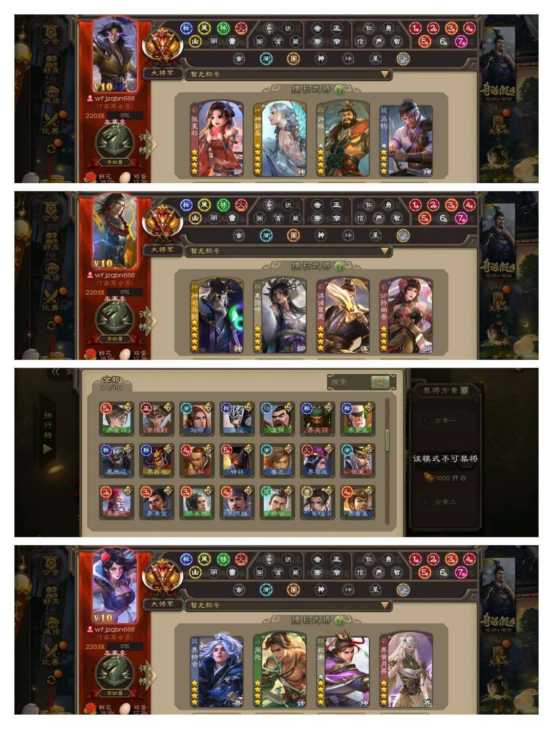 官方二等大将军,无卡,VIP10! 1五星炎龙:动神司马懿! 15四星玉龙:回廊动卑弥呼,动谋诸葛亮动神郭嘉动许攸,金马钧金祢衡,杜预! 45史诗武将,动谋马超,金界李儒,界左慈神赵云界钟会南华老仙花鬘周处等! 44动皮120金皮189国战皮肤!