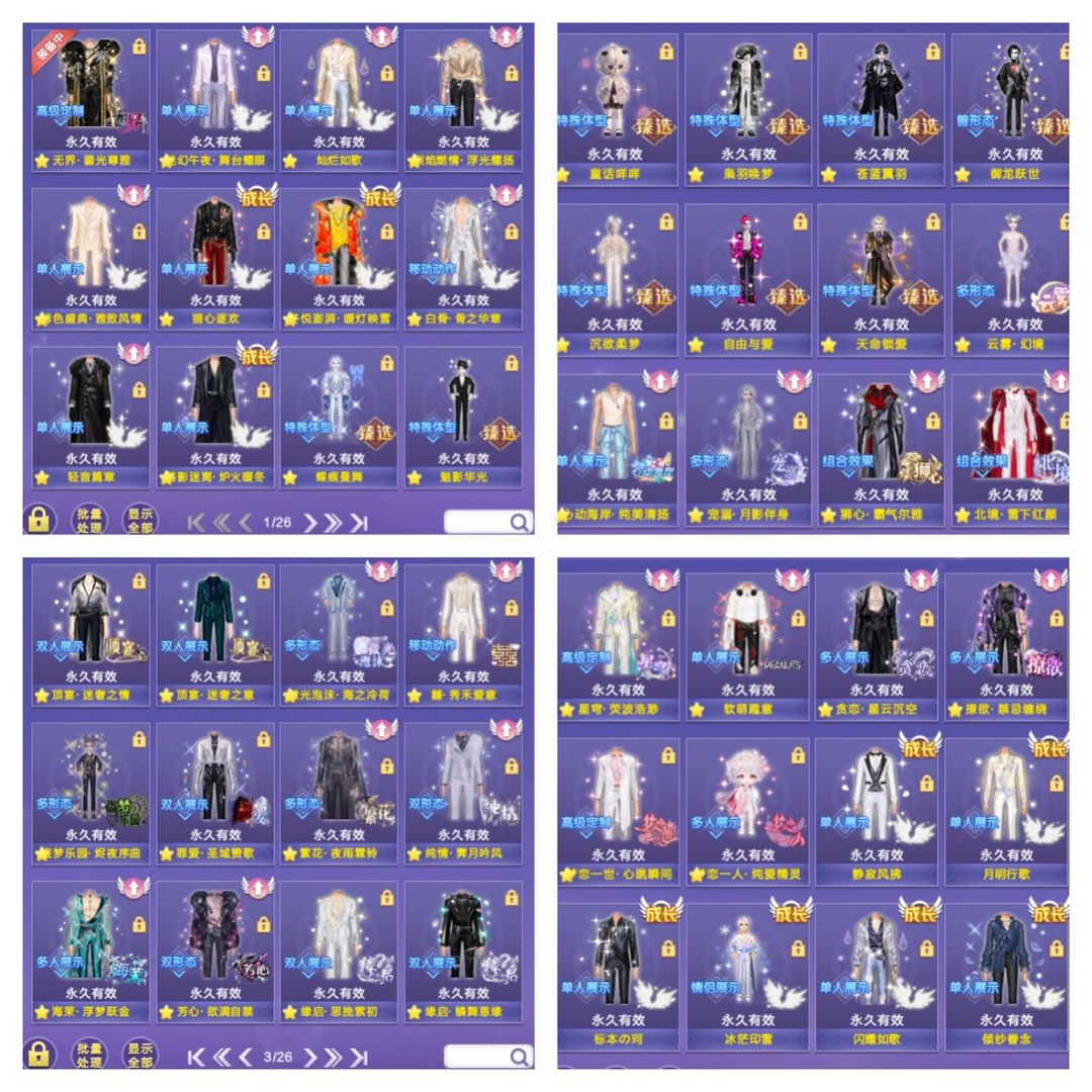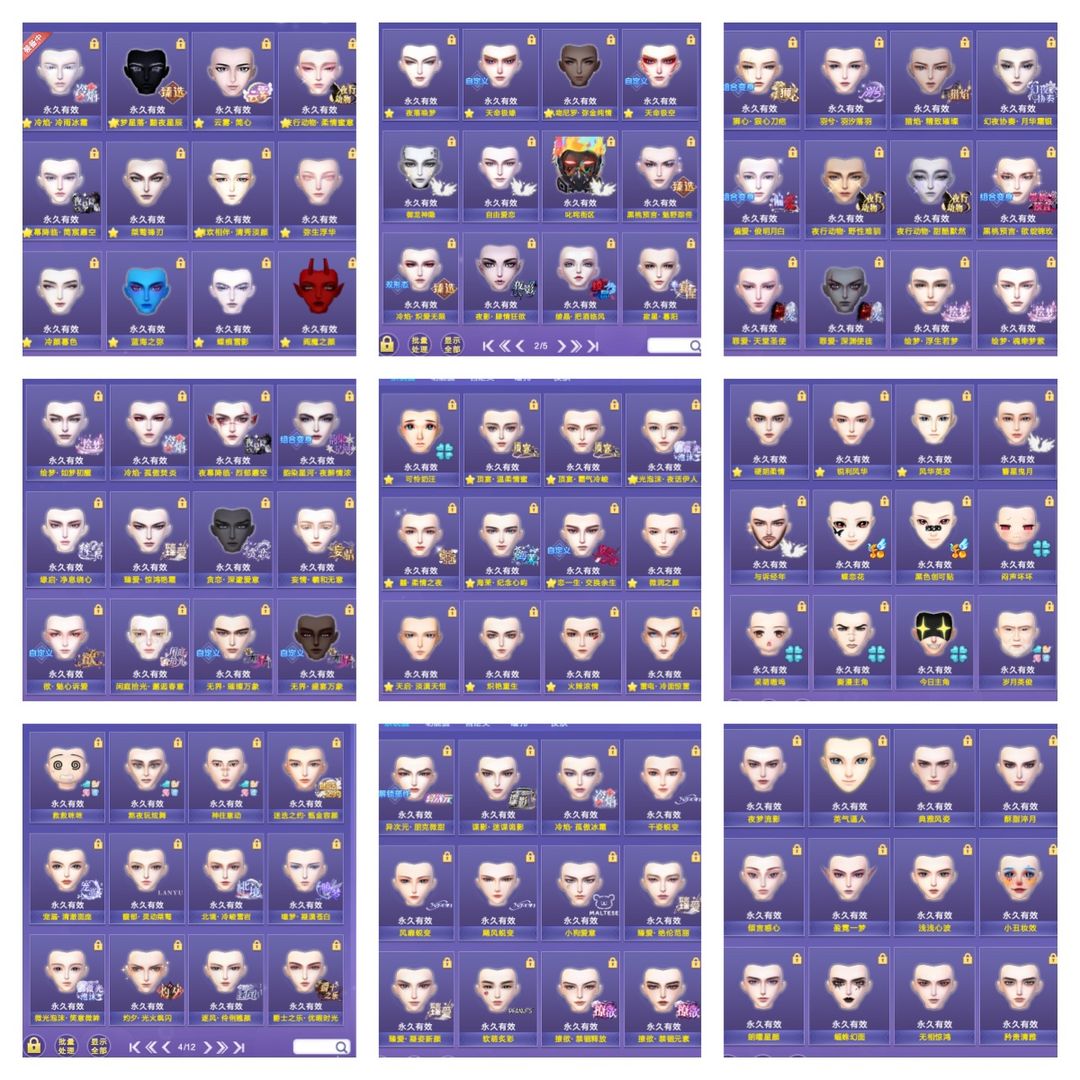 皇冠11彩钻男号 月光:微光泡沫二级变 宠溺三级变 狮心三级变 黑脸 红脸 兔子脸 顶宴 罪爱 北境 76个外搭 149个坐骑 功能脸52个 全景80个 功能套装310个