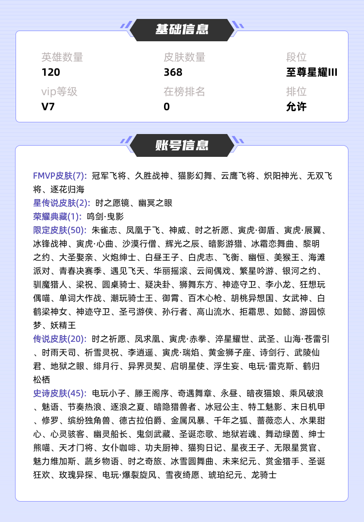 >>>>>>毁号,涉及毁坏虚拟财产罪及计算机安全罪,请文明游戏素质游戏,让我们共建美好租号平台>>>>>> 本游戏账号: ,英雄多,皮肤多。典藏皮肤1个,感受典藏皮肤带来的优质体验快感,FMVP皮肤7个,尽情享受FMVP皮肤带来的主角光环, 私人所属英雄皮肤有:李白 鸣剑·曳影达摩 黄金狮子座||关羽 武圣||孙尚香 异界灵契||李白 凤求凰||李白 诗剑行||诸葛亮 时雨天司||诸葛亮 武陵仙君||夏洛特 浮生妄||虞姬 启明星使||瑶 时之祈愿||澜 电玩·雷克斯||不知火舞 绯月行||赵云 淬星耀世||鲁班七号 寅虎·瑞焰||曜 李逍遥||曜 山海·苍雷引||裴擒虎 寅虎·赤拳||云缨 鹤归松栖||公孙离 祈雪灵祝||宫本武藏 地狱之眼,等等 注意事项: A.游戏过程中请不要恶意挂机或者不文明发言;B.恶意挂机、顶号等行为将被拉黑无法再次下单;C.进入游戏后中途请勿退出登陆,否则无法再次上号;D.部分账号由于异地登录可能会出现密码错误提示,通常再尝试5-6次后可上号。 |||||||||>喜欢本账号请点 ☆收藏☆ 方便下次租用,谢谢光临惠顾|||||||||