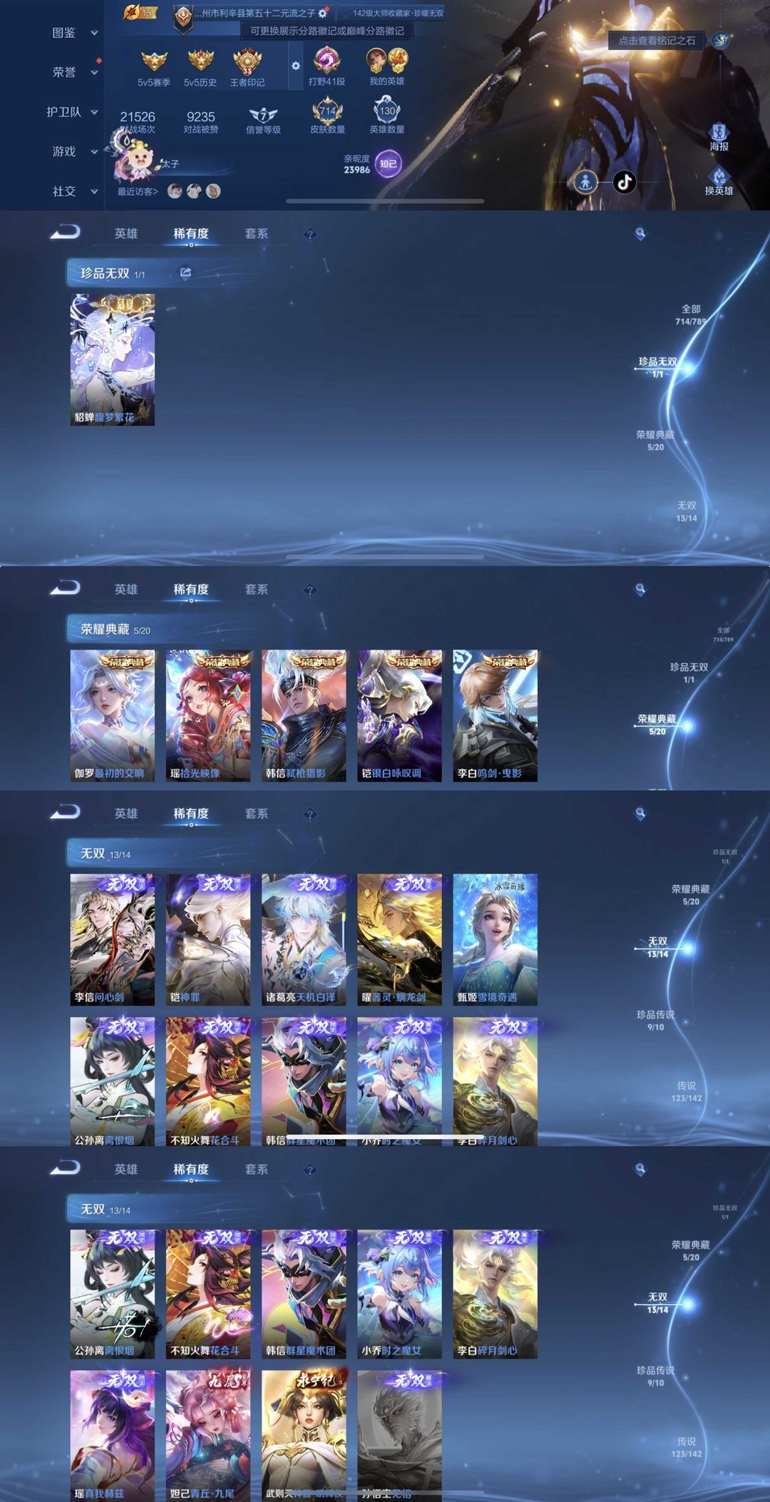 时间到了还登录白玩或者顶号全部改密拉黑处理永不解除,顶号机器会秒禁玩改密,顶号不仅拉黑还没得玩,赚三两块不容易,请理解谢谢。 ❤❤❤❤❤❤❤❤❤❤❤❤❤❤❤❤❤❤❤ 请勿开挂,挂机,送头,骂人,撤单后游戏等如有违规永久拉黑永不解除。 重置二级密码不要费劲了,号主每天都会上号查看,多行不义必自毙,人在做天在看,多做好事多自律,少做缺德事。 该号英雄130个皮肤714个,珍品无双1个,典藏6个,无双13个,珍品传说9个,星传说6个,传说123个,史诗250个,祝您游戏愉快~