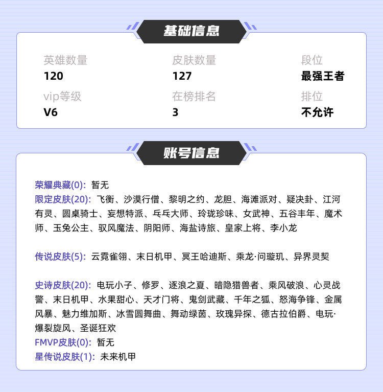 >>>>>>毁号,涉及毁坏虚拟财产罪及计算机安全罪,请文明游戏素质游戏,让我们共建美好租号平台>>>>>> 本游戏账号: ,英雄多,皮肤多。 私人所属英雄皮肤有:孙尚香 末日机甲||孙尚香 异界灵契||孙尚香 乘龙·问璇玑||虞姬 云霓雀翎||铠 冥王哈迪斯鲁班大师 乓乓大师||达摩 沙漠行僧||戈娅 驭风魔法||鬼谷子 五谷丰年||李元芳 妄想特派||明世隐 疑决卦||桑启 海盐诗旅||韩信 飞衡||狄仁杰 魔术师||狄仁杰 阴阳师||阿古朵 江河有灵||项羽 海滩派对||赵云 龙胆||赵云 皇家上将||艾琳 女武神||裴擒虎 李小龙||盾山 圆桌骑士||雅典娜 黎明之约||公孙离 玉兔公主||西施 玲珑珍味,等等 注意事项: A.游戏过程中请不要恶意挂机或者不文明发言;B.恶意挂机、顶号等行为将被拉黑无法再次下单;C.进入游戏后中途请勿退出登陆,否则无法再次上号;D.部分账号由于异地登录可能会出现密码错误提示,通常再尝试5-6次后可上号。 |||||||||>喜欢本账号请点 ☆收藏☆ 方便下次租用,谢谢光临惠顾|||||||||