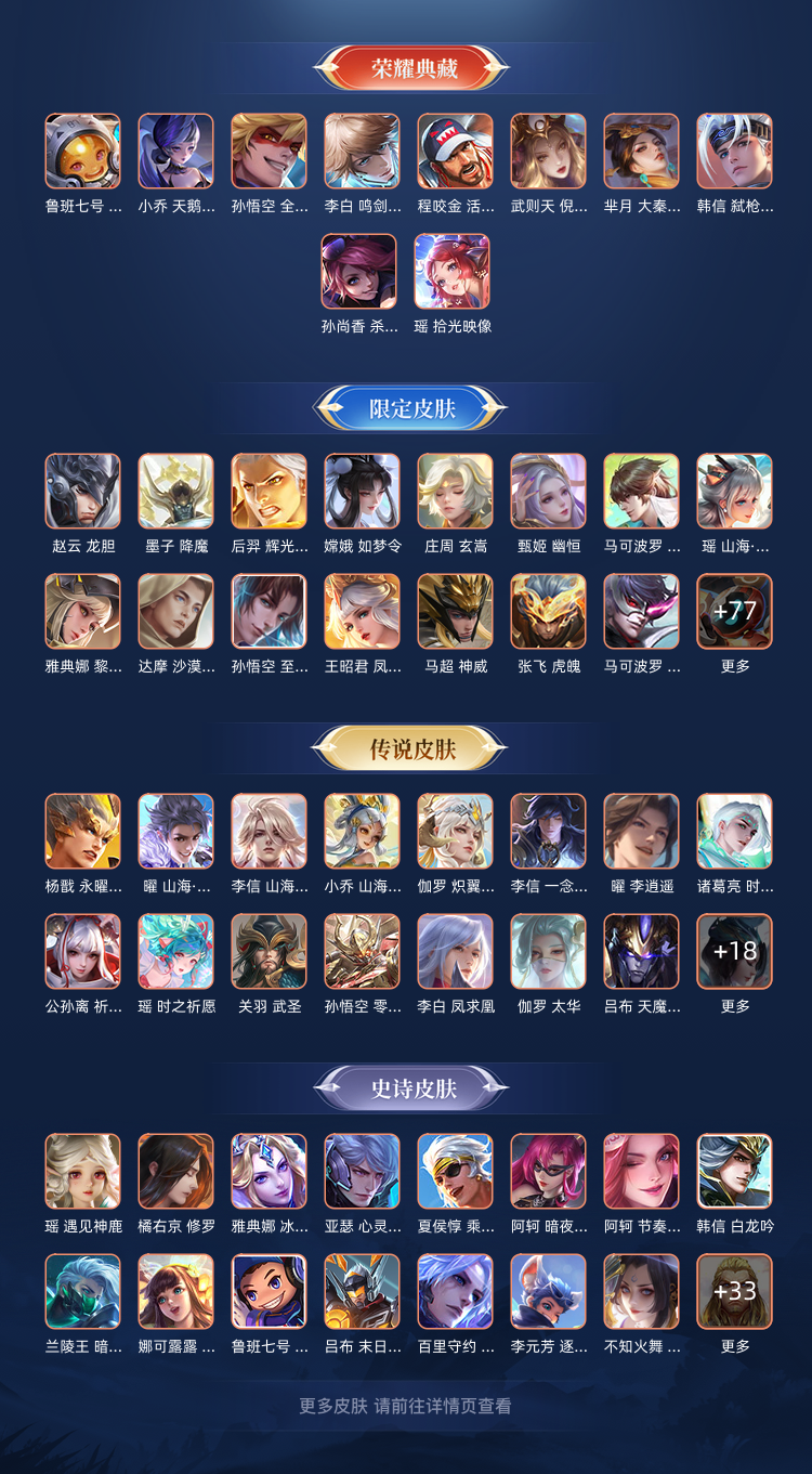 毁号,涉及毁坏虚拟财产罪及计算机安全罪,请文明游戏素质游戏,让我们共建美好租号平台 本游戏账号: 英雄多皮肤多。典藏皮肤9个感受典藏皮肤带来的优质体验快感FMVP皮肤3个尽情享受FMVP皮肤带来的主角光环 私人所属英雄皮肤有:李白 鸣剑·曳影芈月 大秦宣太后韩信 弑枪猎影花木兰 九霄神辉貂蝉 幻阙歌夏侯惇 无限飓风号铠 银白咏叹调杨戬 永曜之星百里守约 碎云达摩 黄金狮子座梦奇 胖达荣荣孙尚香 末日机甲孙尚香 异界灵契关羽 武圣李信 一念神魔李信 山海·炽霜斩李白 凤求凰李白 诗剑行妲己 青丘·九尾诸葛亮 时雨天司诸葛亮 武陵仙君诸葛亮 鹤羽星尊孙悟空 齐天大圣孙悟空 零号·赤焰孙悟空 地狱火上官婉儿 神器·万象笔上官婉儿 妄想奇谈安琪拉 追逃游戏大乔 挚爱花嫁大乔 时之奇旅狄仁杰 神器·狴犴令狄仁杰 超时空战士狄仁杰 夜礼服假面王昭君 星穹之声王昭君 永恒水手月亮后羿 无尽星芒后羿 黄金射手座夏洛特 浮生妄