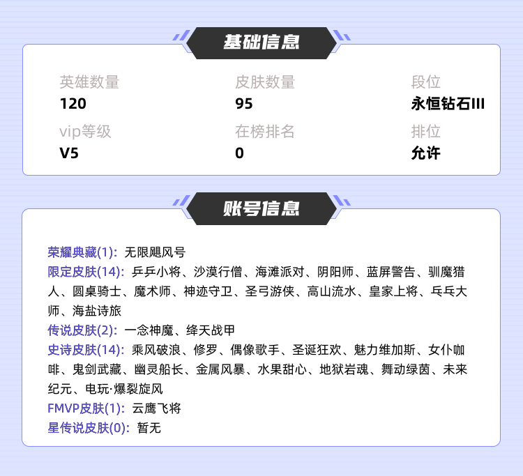 >>>>>>毁号,涉及毁坏虚拟财产罪及计算机安全罪,请文明游戏素质游戏,让我们共建美好租号平台>>>>>> 本游戏账号: V5用户,基础段位:永恒钻石III,英雄多,皮肤多。典藏皮肤1个,感受典藏皮肤带来的优质体验快感,FMVP皮肤1个,尽情享受FMVP皮肤带来的主角光环, 私人所属英雄皮肤有:夏侯惇 无限飓风号铠 绛天战甲||李信 一念神魔曜 云鹰飞将兰陵王 驯魔猎人||桑启 海盐诗旅||典韦 蓝屏警告||达摩 沙漠行僧||庄周 高山流水||狄仁杰 魔术师||后羿 圣弓游侠||鲁班七号 乒乒小将||盾山 圆桌骑士||赵云 皇家上将||狄仁杰 阴阳师||鲁班大师 乓乓大师||项羽 海滩派对||墨子 神迹守卫,等等 注意事项: A.游戏过程中请不要恶意挂机或者不文明发言;B.恶意挂机、顶号等行为将被拉黑无法再次下单;C.进入游戏后中途请勿退出登陆,否则无法再次上号;D.部分账号由于异地登录可能会出现密码错误提示,通常再尝试5-6次后可上号。 |||||||||>喜欢本账号请点 ☆收藏☆ 方便下次租用,谢谢光临惠顾|||||||||