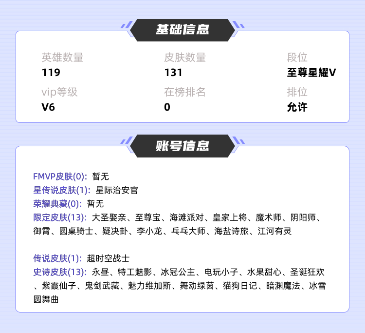>>>>>>毁号,涉及毁坏虚拟财产罪及计算机安全罪,请文明游戏素质游戏,让我们共建美好租号平台>>>>>> 本游戏账号: ,英雄多,皮肤多。 私人所属英雄皮肤有:狄仁杰 超时空战士鲁班大师 乓乓大师||孙悟空 大圣娶亲||孙悟空 至尊宝||明世隐 疑决卦||桑启 海盐诗旅||狄仁杰 阴阳师||狄仁杰 魔术师||米莱狄 御霄||阿古朵 江河有灵||项羽 海滩派对||赵云 皇家上将||盾山 圆桌骑士||裴擒虎 李小龙,等等 注意事项: A.游戏过程中请不要恶意挂机或者不文明发言;B.恶意挂机、顶号等行为将被拉黑无法再次下单;C.进入游戏后中途请勿退出登陆,否则无法再次上号;D.部分账号由于异地登录可能会出现密码错误提示,通常再尝试5-6次后可上号。 |||||||||>喜欢本账号请点 ☆收藏☆ 方便下次租用,谢谢光临惠顾|||||||||