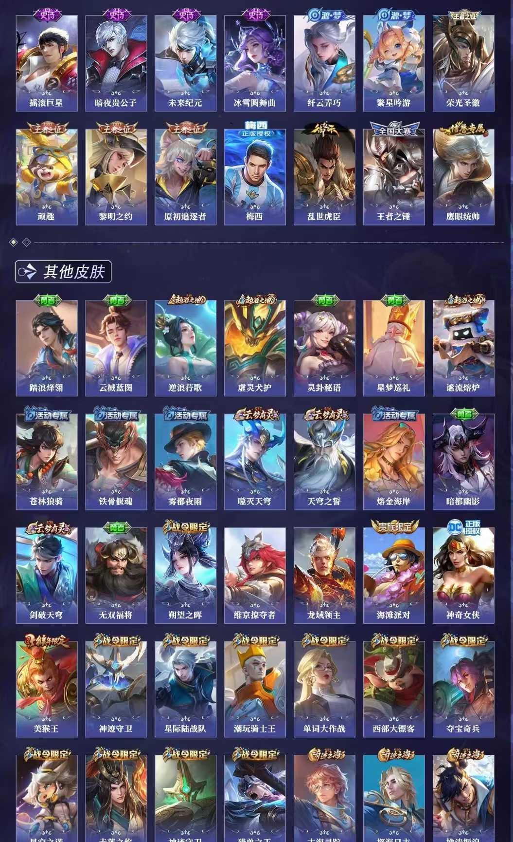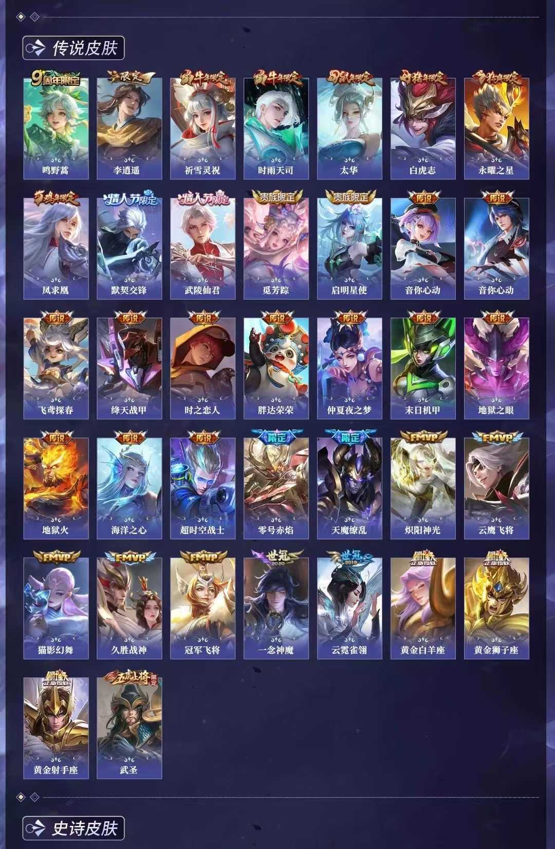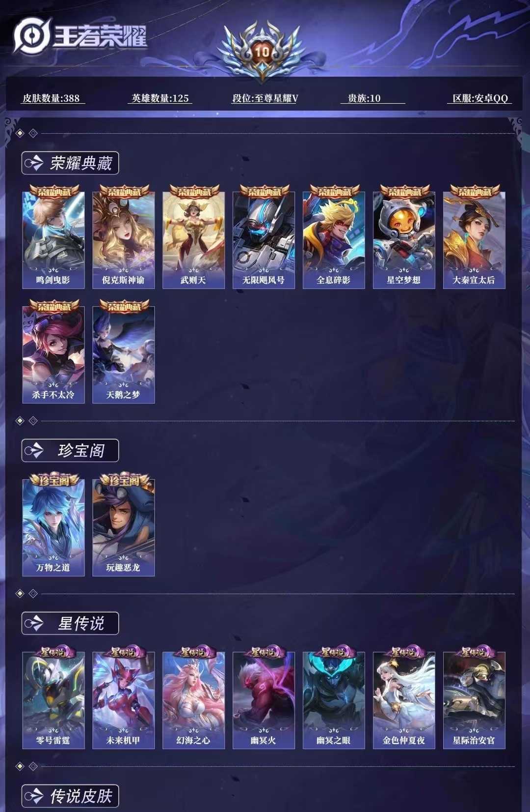 【C65】贵族V10~390皮肤9典藏祈雪灵祝,武圣,神威,至尊宝,天魔缭乱,凤求凰,白虎志,梅西,全息碎影天鹅之梦无限飓风号,倪克斯神谕,大秦宣太后,星空梦想,杀手不太冷【全牛年,全五虎上将,全五岳,全五兽】