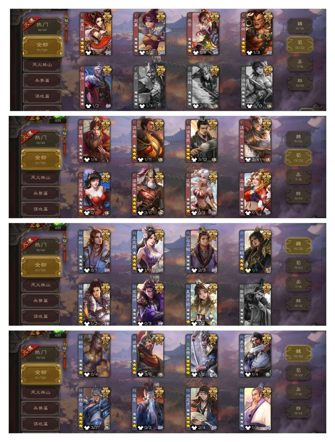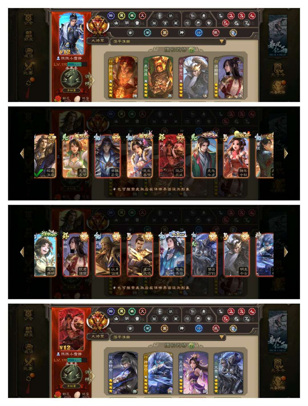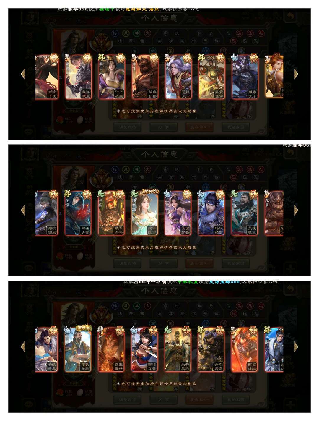 官方三等大将军,有卡,VIP12! 8四星玉龙:回廊双形态至臻动界钟会,奇门动谋貂蝉,回廊动文鸯,回廊动神孙策,回廊动谋黄忠,回廊动界徐盛,回廊动王元姬,动神甘宁! 51史诗武将:回廊动杜预,回廊动聚义,动司马昭动孙寒华动谋诸葛亮,动谋曹操动界李儒动留赞,金谋黄盖金界左慈金周处,谋刘备谋夏侯氏神华佗神太史慈神赵云南华老仙,鲍信阎象曹嵩谋黄月英! 41动皮87金皮175国战皮肤!