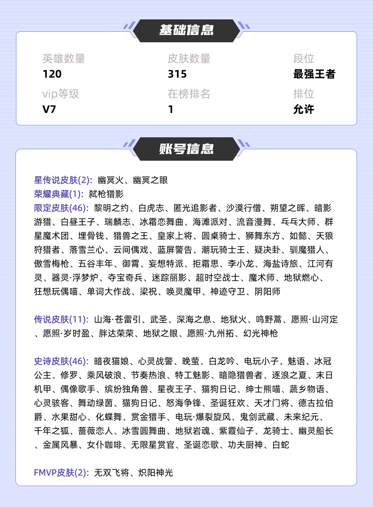 >>>>>>毁号,涉及毁坏虚拟财产罪及计算机安全罪,请文明游戏素质游戏,让我们共建美好租号平台>>>>>> 本游戏账号: ,英雄多,皮肤多。典藏皮肤1个,感受典藏皮肤带来的优质体验快感,FMVP皮肤2个,尽情享受FMVP皮肤带来的主角光环, 私人所属英雄皮肤有:韩信 弑枪猎影孙悟空 地狱火||桑启 鸣野蒿||虞姬 愿照·岁时盈||澜 愿照·九州拓||司空震 愿照·山河定||曜 山海·苍雷引||云缨 幻光神枪||马可波罗 深海之息||宫本武藏 地狱之眼||梦奇 胖达荣荣||关羽 武圣,等等 注意事项: A.游戏过程中请不要恶意挂机或者不文明发言;B.恶意挂机、顶号等行为将被拉黑无法再次下单;C.进入游戏后中途请勿退出登陆,否则无法再次上号;D.部分账号由于异地登录可能会出现密码错误提示,通常再尝试5-6次后可上号。 |||||||||>喜欢本账号请点 ☆收藏☆ 方便下次租用,谢谢光临惠顾|||||||||