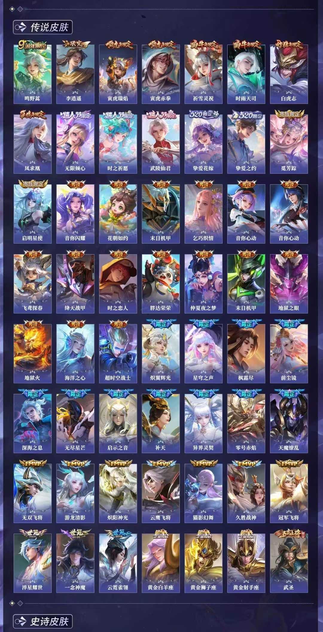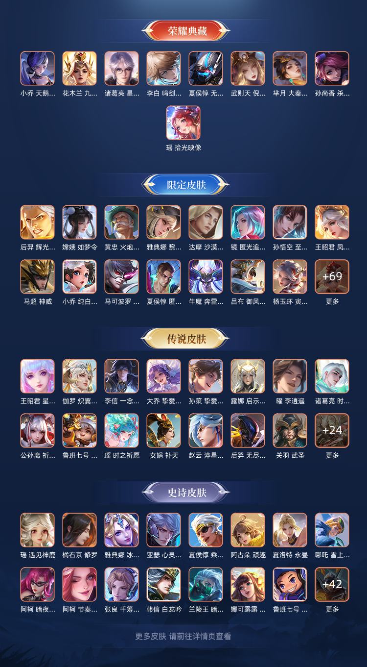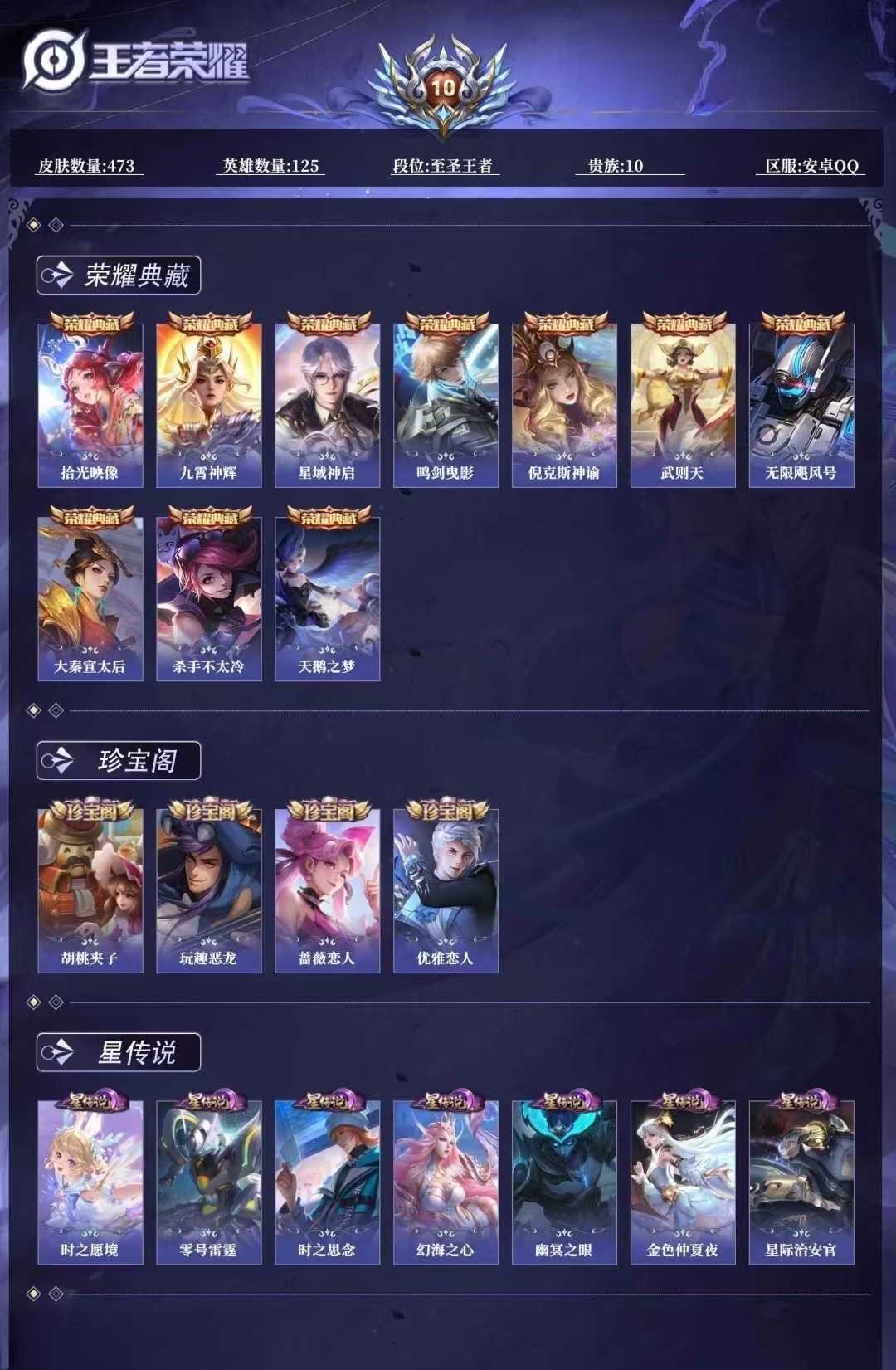 【C217】贵族V10~472皮肤9水晶56传说18金标瑶典藏紫情瑶,时之映像,无限倾心,炽翼辉光,前尘镜,无双飞将,启示之音,九霄神辉,星域神启,倪克斯神谕,星穹之声,女娲补天,虎年鲁班,李逍遥,祈雪灵祝,天魔缭乱,鸣剑曳影,无限飓风号,大秦宣太后,天鹅之梦,杀手不太冷【全山海情兔年,全寅虎,全五虎上将,全牛年,全五兽】