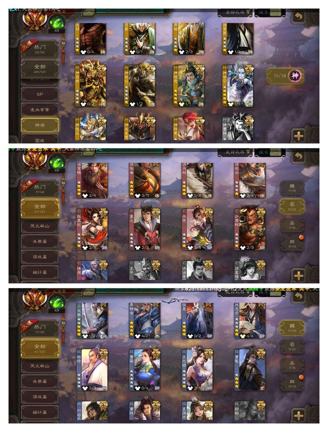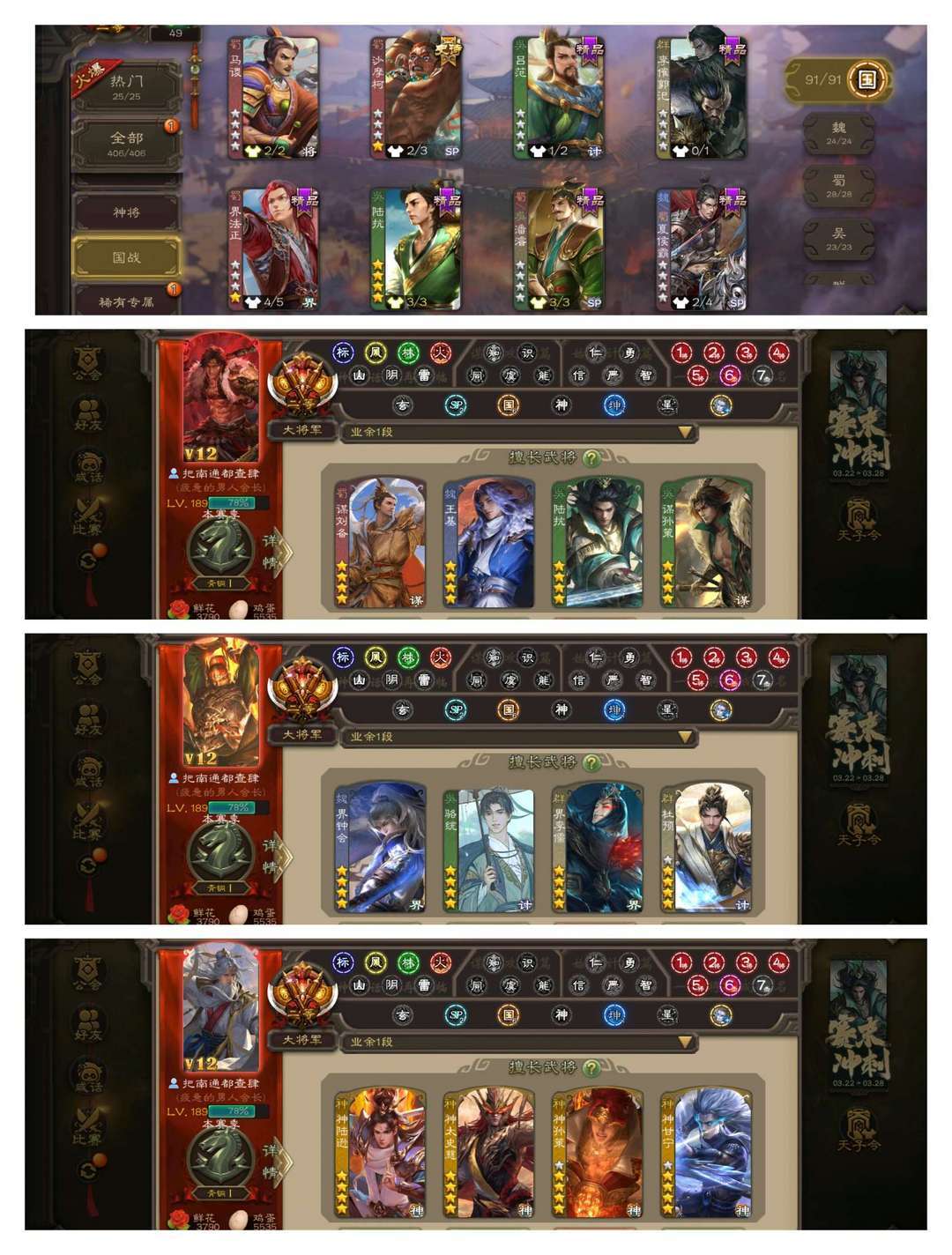 官方二等大将军,有卡,VIP12! 15四星玉龙:回廊双形态至臻动杜预,回廊双形态至臻动界钟会,回廊动神孙策,回廊动神太史慈,动神甘宁动神陆逊动谋刘备动谋孙策动界李儒,金骆统! 47史诗武将:回廊动文鸯,回廊动聚义,回廊动南华老仙,回廊动界徐盛,动司马昭动留赞动王元姬动戏志才,金周处金神赵云,曹髦曹婴裴秀张琪瑛,鲍信阎象谋黄月英! 116排位武将91国战武将,66动皮190金皮235国战皮肤!