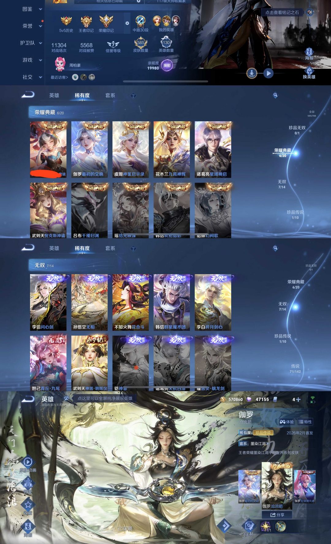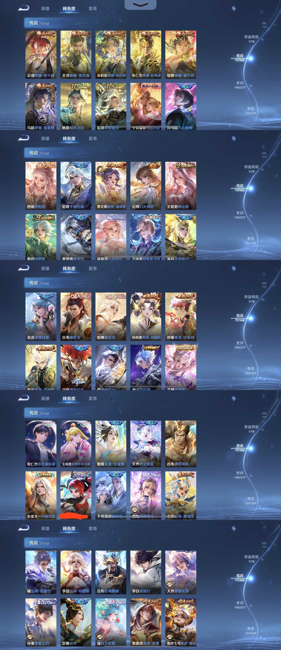 时间到了还登录白玩或者顶号全部改密拉黑处理永不解除,顶号机器会秒禁玩改密,顶号不仅拉黑还没得玩,赚三两块不容易,请理解谢谢。 ❤❤❤❤❤❤❤❤❤❤❤❤❤❤❤ 请勿开挂,挂机,送头,骂人,撤单后游戏等如有违规永久拉黑永不解除。 重置二级密码不要费劲了,号主每天都会上号查看,多行不义必自毙,人在做天在看,多做好事多自律,少做缺德事。 该号英雄130个皮肤585个,典藏7个,无双7个,珍品传说1个,星传说7个,传说71个,史诗195个,祝你游戏愉快~