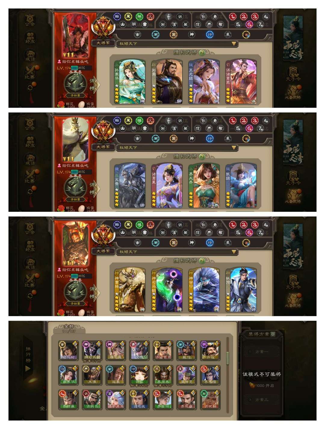 官方三等大将军,有卡,VIP11! 13四星玉龙:回廊动文鸯,回廊动孙寒华,回廊动杜预,动刘焉动神曹操动神甘宁动神司马懿,动谋诸葛亮动王元姬! 47史诗武将:回廊动聚义,回廊动界徐盛,动司马昭动界左慈动神赵云,金戏志才,杨彪界李儒界钟会神陆逊神吕布留赞,鲍信阎象谋黄月英! 100排位武将85国战武将,34动皮95金皮165国战皮肤!