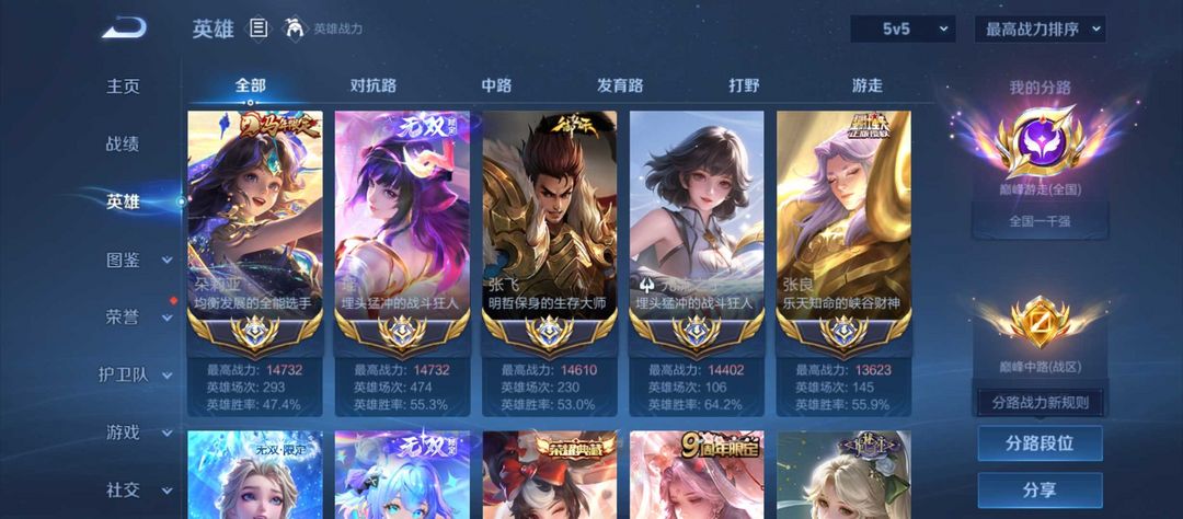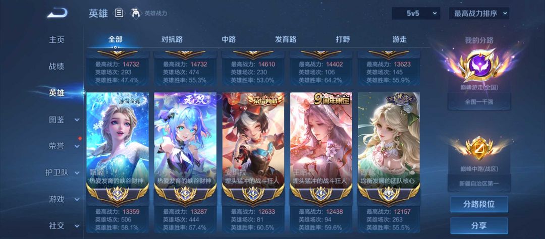 - 巅峰榜排名:1名/1名/2827名/6355名/1名|对抗路/打野/中路/游走/发育路