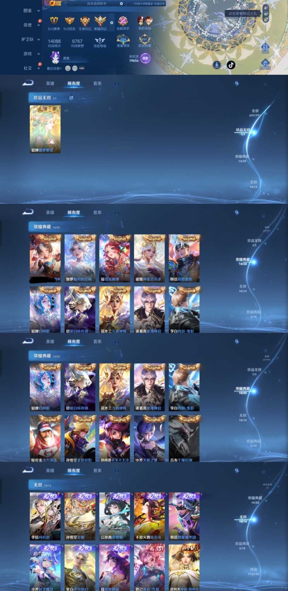 时间到了还登录白玩或者顶号全部改密拉黑处理永不解除,顶号机器会秒禁玩改密,顶号不仅拉黑还没得玩,赚三两块不容易,请理解谢谢。 ❤❤❤❤❤❤❤❤❤❤❤❤❤❤❤ 请勿开挂,挂机,送头,骂人,撤单后游戏等如有违规永久拉黑永不解除。 重置二级密码不要费劲了,号主每天都会上号查看,多行不义必自毙,人在做天在看,多做好事多自律,少做缺德事。 该号英雄130个皮肤697个,珍品无双1个,典藏15个,无双10个,珍品传说6个,星传说11个,传说114个,史诗237个,祝您游戏愉快~