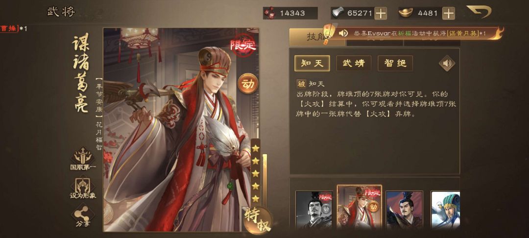 V10大将军,有某诸葛!祢衡,魔司马懿,南华老仙,谋黄月英,鲍三娘,魔貂蝉已氪!(感谢各位的光顾,为了你们的长期体验请不要用银两购买桃花或者其他道具,银两只能购买三卡!谢谢合作)480武将 界曹植已拿,11大祈福 7大翻有蒲元周群张华神张角夏侯玄族吴苋族荀谌,16祈愿台有祢衡魔司马懿SP刘备谋姜维谋庞统谋关羽谋袁绍丁尚涴胡金定孙茹,皮肤1926,限定动态100+,琳琅动态,强将基本都有动皮,详细看图。定期更新武将。 ★望租客素质租号,乱用包裹内各种物品,包括元宝,皮肤包,各种宝箱等,一经发现直接拉黑并投诉。