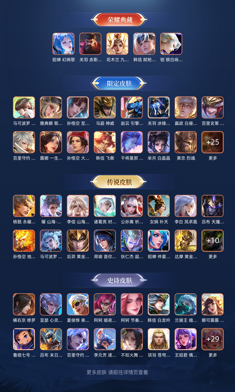 V10 414皮7典藏1无双碎月剑心弑枪猎影银白咏叹调无限飓风号鸣剑·曳影天鹅之梦 皮肤数量:414 荣耀水晶:7 [珍品无双皮肤]: [无双数量]:1 [珍品数量]:0 [传说数量]:39 [限定数量]:176 [无双皮肤]:李白-碎月剑心 [珍品传说皮肤]: [荣耀典藏]:韩信-弑枪猎影/铠-银白咏叹调/夏侯惇-无限飓风号/李白-鸣剑·曳影/孙悟空-全息碎影/鲁班七号-星空梦想/小乔-天鹅之梦 [传说皮肤]:桑启-鸣野蒿/孙策-乘龙·淬吴钩/赵云-乘龙·铭钟鼎/孙尚香-乘龙·问璇玑/马超-琥珀纪元/艾琳-觅芳踪/诸葛亮-鹤羽星尊/张飞-百相守梦/夏洛特-浮生妄/孙悟空-齐天大圣/曜-山海·苍雷引/小乔-山海·琳琅生/李信-山海·炽霜斩/李白-诗剑行/虞姬-云霓雀翎/橘右京-枫霜尽/鲁班七号-寅虎·瑞焰/裴擒虎-寅虎·赤拳/孙尚香-异界灵契/伽罗-太华/赵云-淬星耀世/曜-李逍遥 /兰陵王-默契交锋/诸葛亮-时雨天司/公孙离-祈雪灵祝/虞姬-启明星使/孙悟空-零号·赤焰/李信-一念神魔/百里玄策-白虎志/花木兰-冠军飞将/吕布-天魔缭乱/杨戬-永曜之星/诸葛亮-武陵仙君/李白-凤求凰