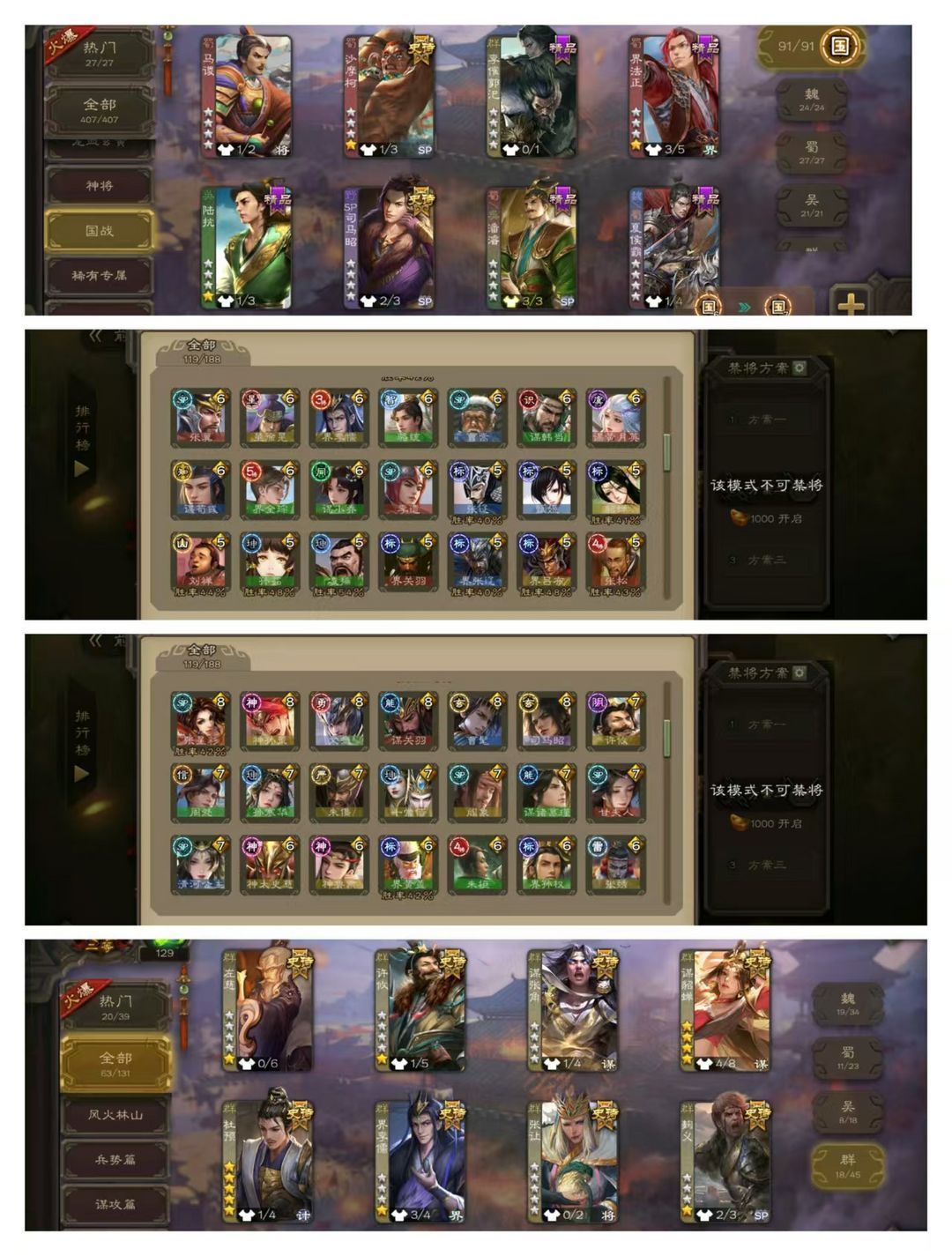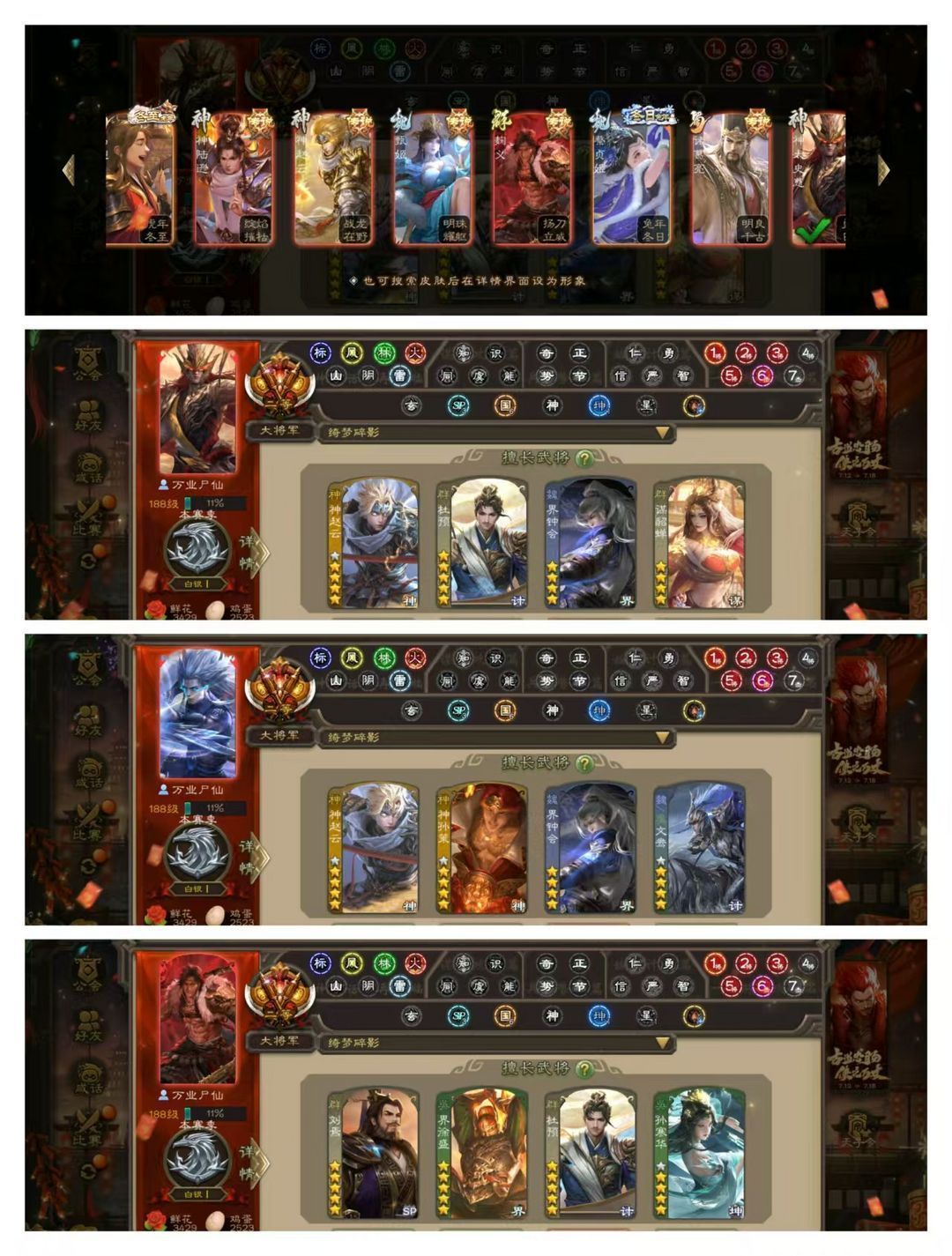 官方二等大将军,无卡,VIP11! 3五星炎龙:回廊双形态至臻动杜预,回廊动界徐盛,动刘焉! 6个四星玉龙:回廊双形态至臻动界钟会,回廊典藏/奇门双动谋貂蝉,奇门动孙寒华,回廊动神赵云,回廊动神孙策,回廊动文鸯! 63史诗武将:回廊动神太史慈,回廊动聚义,动神郭嘉动神甘宁动神陆逊动谋关羽,动司马昭动清河公主动留赞动界李儒,曹髦神鲁肃十常侍神吕布王元姬阎象谋黄月英曹嵩! 119排位武将91国战武将,42动皮95金皮190国战皮肤