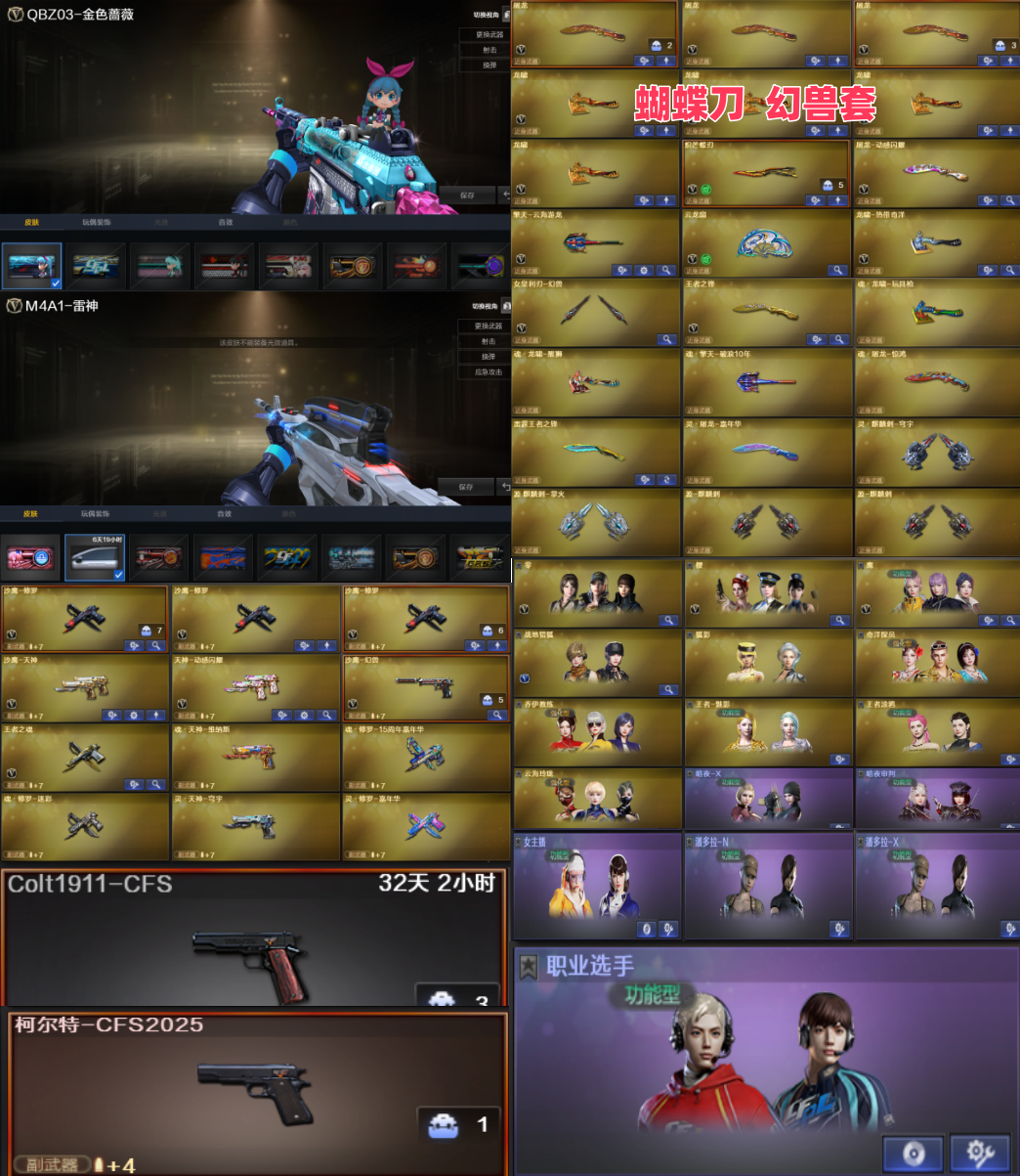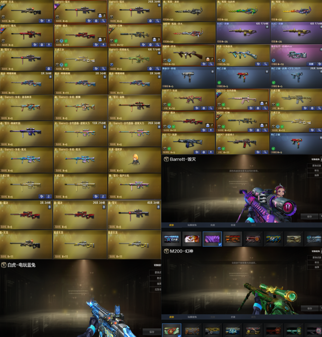 王者武器:闪光弹-雷霆王者-觉醒版;高爆手雷-雷霆王者;烟雾弹-雷霆王者-觉醒版;王者霜心;炫金无影;炫金毁灭;王者之啸-觉醒版;王者之魄高爆手雷;王者之魄闪光弹;炫金天龙;王者之心-觉醒版 英雄武器:机械迷城-穹宇;黑骑士-海王;AK12-天启;高爆手雷-竞技荣光;闪光弹-云龙;烟雾弹-云龙;高爆手雷-云龙;黑武士-锦绣游龙;手雷-热带奇洋;G36C-幻影;天神-动感闪耀;手雷-动感闪耀;沙鹰-修罗;Barrett-暗月传说;柯尔特-冠军之特;Scar Light-白虎;AK47-火麒麟;Barrett-毁灭;M4A1-雷神;麒麟刺;RPK-盘龙;QBZ03-金色蔷薇;M4A1-黑骑士;加特林-炼狱;传说暗裔;沙鹰-天神;斩神刀-雷暴;高爆手雷-雷暴;烟雾弹-雷暴;闪光弹-雷暴;龙啸;M4A1-龙血;M200-幻神;屠龙;AK47-黑鲨;AK47-黑武士 角色:零;猎狐者;飞虎队;刀锋;潘多拉;幻影;堕天使;夜玫瑰;陈龙野-X;娜塔莎;灵狐者;零-水下丽影;灵狐者-黄金海岸;王者零-传说之路;剑齿虎;暗夜-X;炽天使;北极狐-X;妲己;职业选手;王者玲珑-小乔;芳心审判者;社长刀锋;