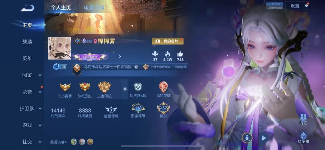 贵族等级V9,段位非凡王者,英雄数量126,典藏皮肤数2,皮肤数量478,纯白花嫁/热情桑巴/久胜战神/器灵·螭龙剑/愿照·九州拓/愿照·众生和/心动手记(朵莉亚)/真我赫兹(瑶)/愿照·福禄聚/时之祈愿瑶/涂山红红/器灵·落星盏/至美·乘鲤谣/愿照·千秋盛/雪境奇遇(甄姬)/拾光映像/大耳狗之梦/玉兔公主/愿照·岁时盈/乘龙·聚宝船/续相思/异界灵契/炽阳神光/青丘·九尾/酷洛米之心/时之魔女/馥梦繁花/纯白花嫁/热情桑巴/久胜战神/器灵·螭龙剑/愿照·九州拓/愿照·众生和/心动手记(朵莉亚)/真我赫兹(瑶)/愿照·福禄聚/时之祈愿瑶/涂山红红/器灵·落星盏/至美·乘鲤谣/愿照·千秋盛/雪境奇遇(甄姬)/拾光映像/大耳狗之梦/玉兔公主/愿照·岁时盈/乘龙·聚宝船/续相思/异界灵契/炽阳神光/青丘·九尾/酷洛米之心/时之魔女/馥梦繁花
