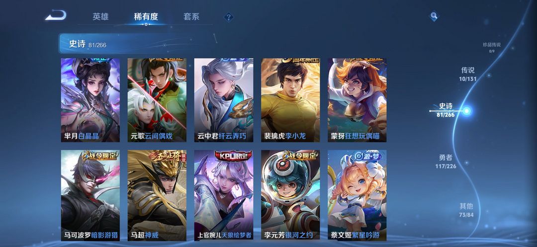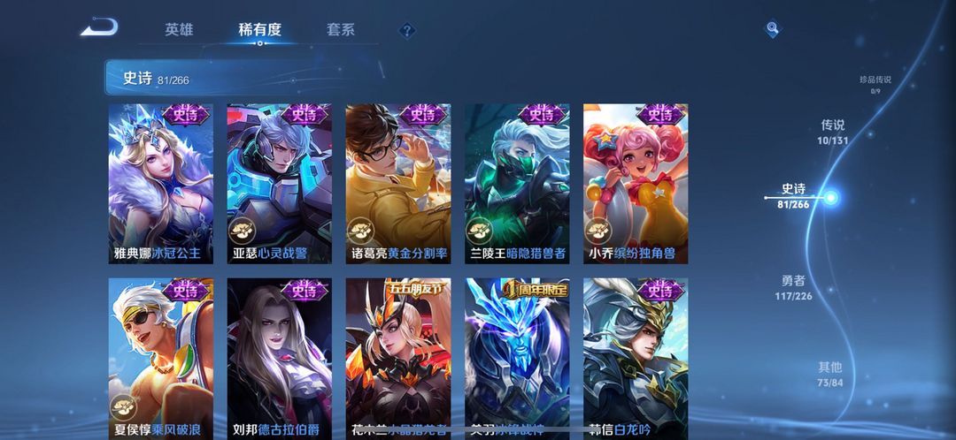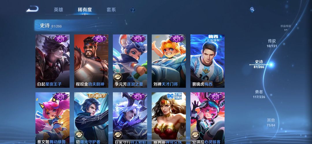 280个皮肤五个荣耀典藏,武则天,倪克斯神谕,无限飓风号,李白鸣剑曳影,猴子全息碎影,还有很多限定皮
