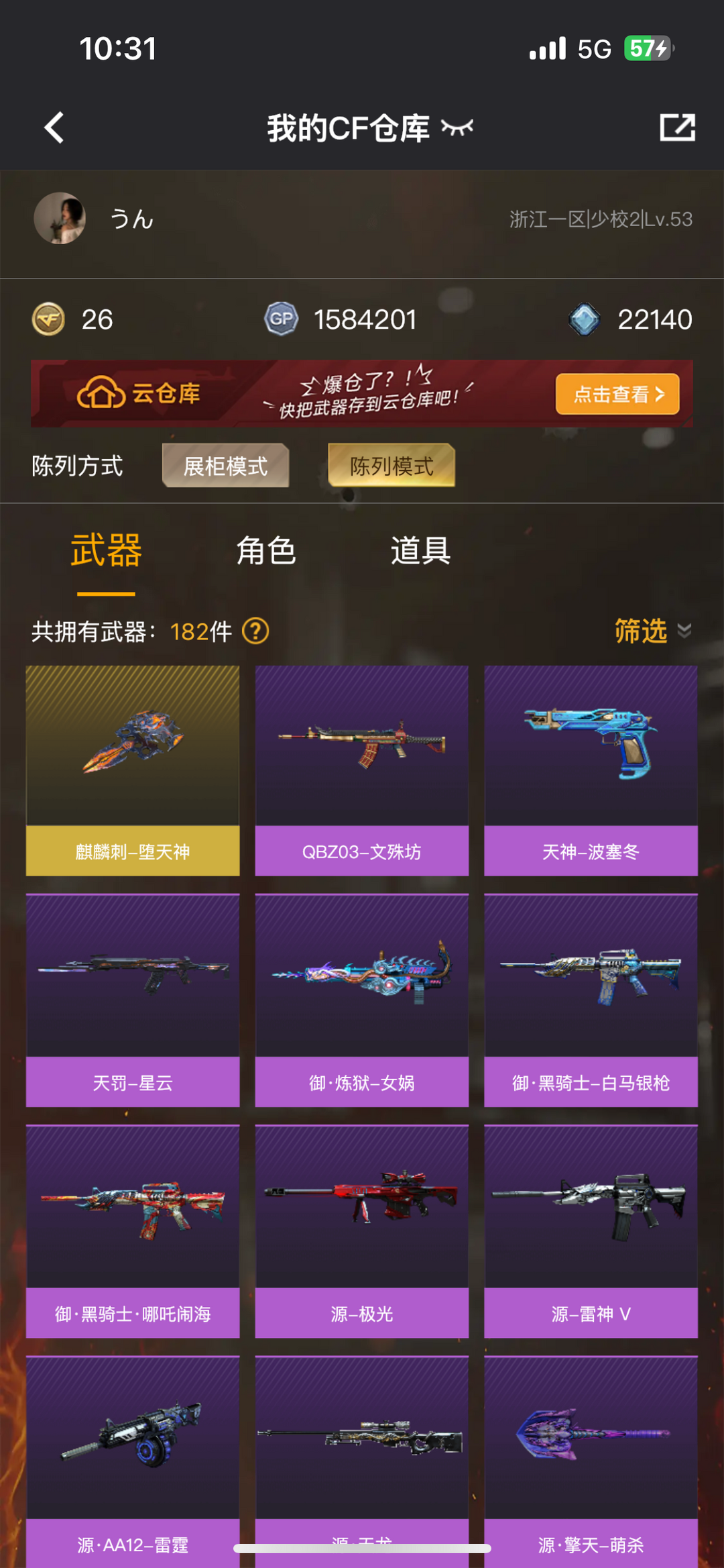 王者武器:王者之圣;王者凤吟 英雄武器:AN94-超新星;屠龙;M200-幻神;柯尔特-竞技荣光;麒麟刺-堕天神;闪光弹-堕天神;烟雾弹-堕天神;高爆手雷-堕天神;Barrett-毁灭;M4A1-黑骑士