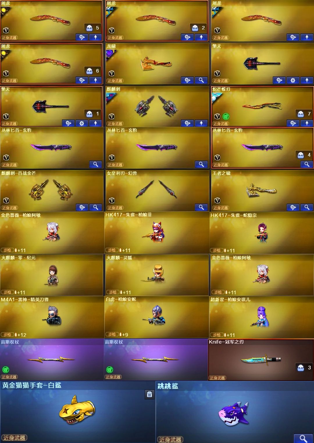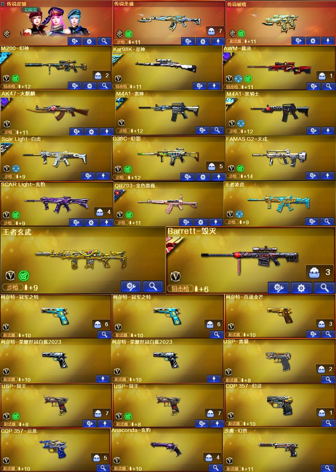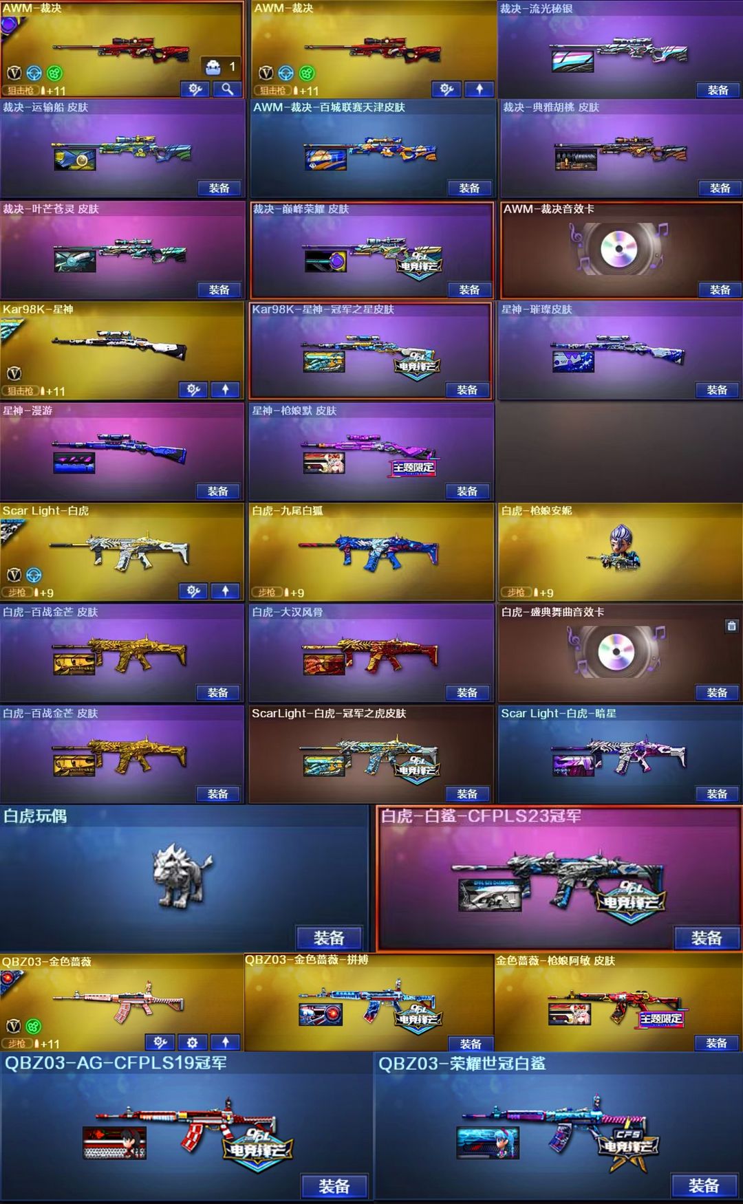 【传说星骇-圣谕-破晓】【神秘礼盒背包】【沙鹰-幻兽】【M200-幻神】【幻神-AG-CFPL S24冠军 -荣耀世冠白鲨2023-星火小队-荣耀世冠白鲨-电流骇客 皮肤】【M200-幻神音效卡】【Kar98K-星神】【Kar98K-星神-冠军之星-漫游-璀璨皮肤-枪娘默 皮肤】【AWM-裁决】【AWM-裁决音效卡】【裁决-巅峰荣耀 -流光秘银-叶芒苍灵 -典雅胡桃 皮肤】【Scar Light-白虎-白鲨-CFPLS23冠军-冠军之虎-大汉风骨-暗星】【王者凌虎】【QBZ03-金色蔷薇】【QBZ03-金色蔷薇-拼搏-荣耀世冠白鲨-AG-CFPLS19冠军】-【G36C-幻影】【王者玄武】【柯尔特-百战金芒】【柯尔特-荣耀世冠白鲨2023】【USP-雷暴】【USP-冥王】【柯尔特-冠军之特】【Anaconda-玄豹】【沙鹰-幻兽】【COP 357-幻灵】【COP 357-云龙】【炽芒蝶刃】【炽芒蝶刃-荣耀世冠白鲨2023 皮肤】【丛林匕首-玄豹】【Knife-冠军之刃】