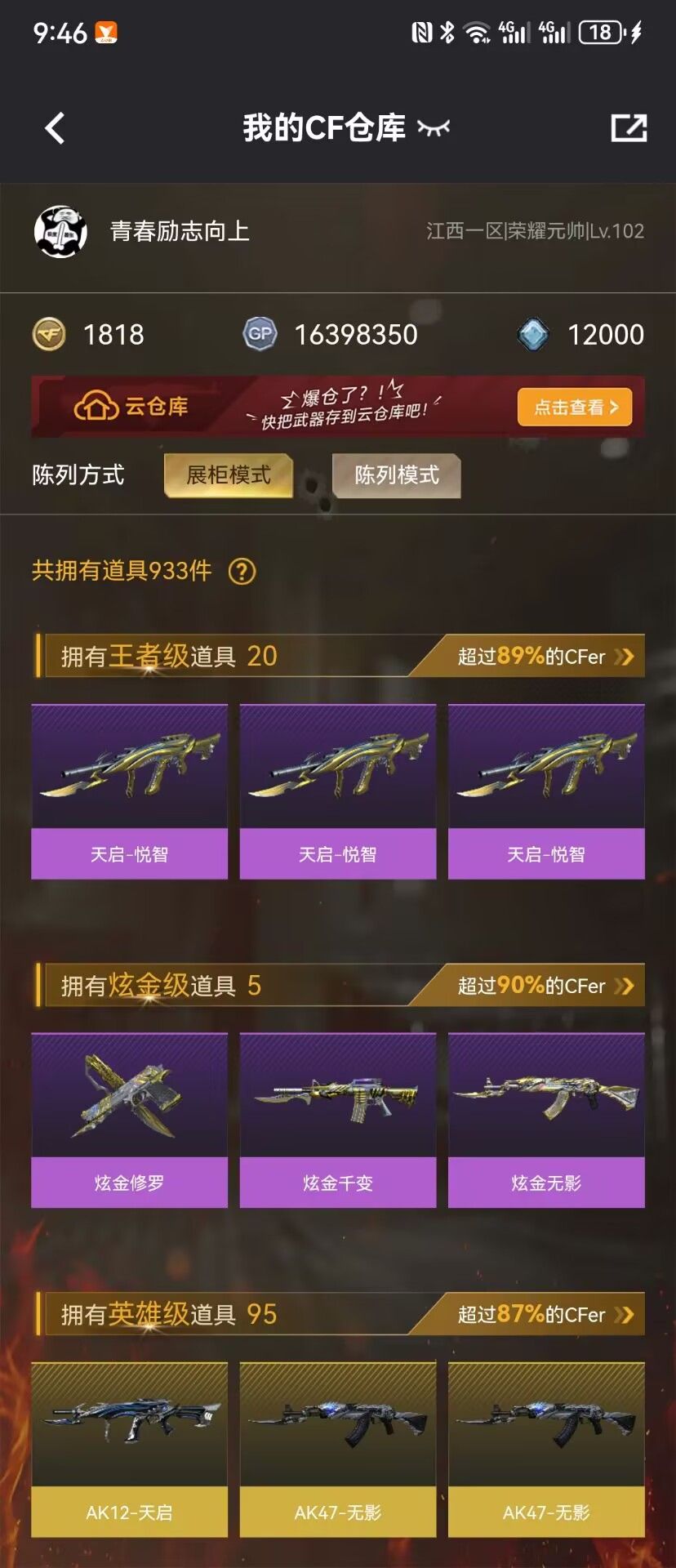 Lv.102荣耀元帅,95V,0传说/20王者/5炫金/95英雄/CF点1818/【重要角色5】王者之瞳/角色-王者零/角色-樱/角色-葵/铁骑荣耀【王者武器18】王者之怒/天启-悦智*3/王者之幻/王者之心/王者之武/玫瑰精灵-悦动*4/超新星-悦享/炼狱-悦蓝*5/王者之击【炫金武器5】炫金毁灭/炫金千变/炫金无影/炫金雷神/炫金修罗