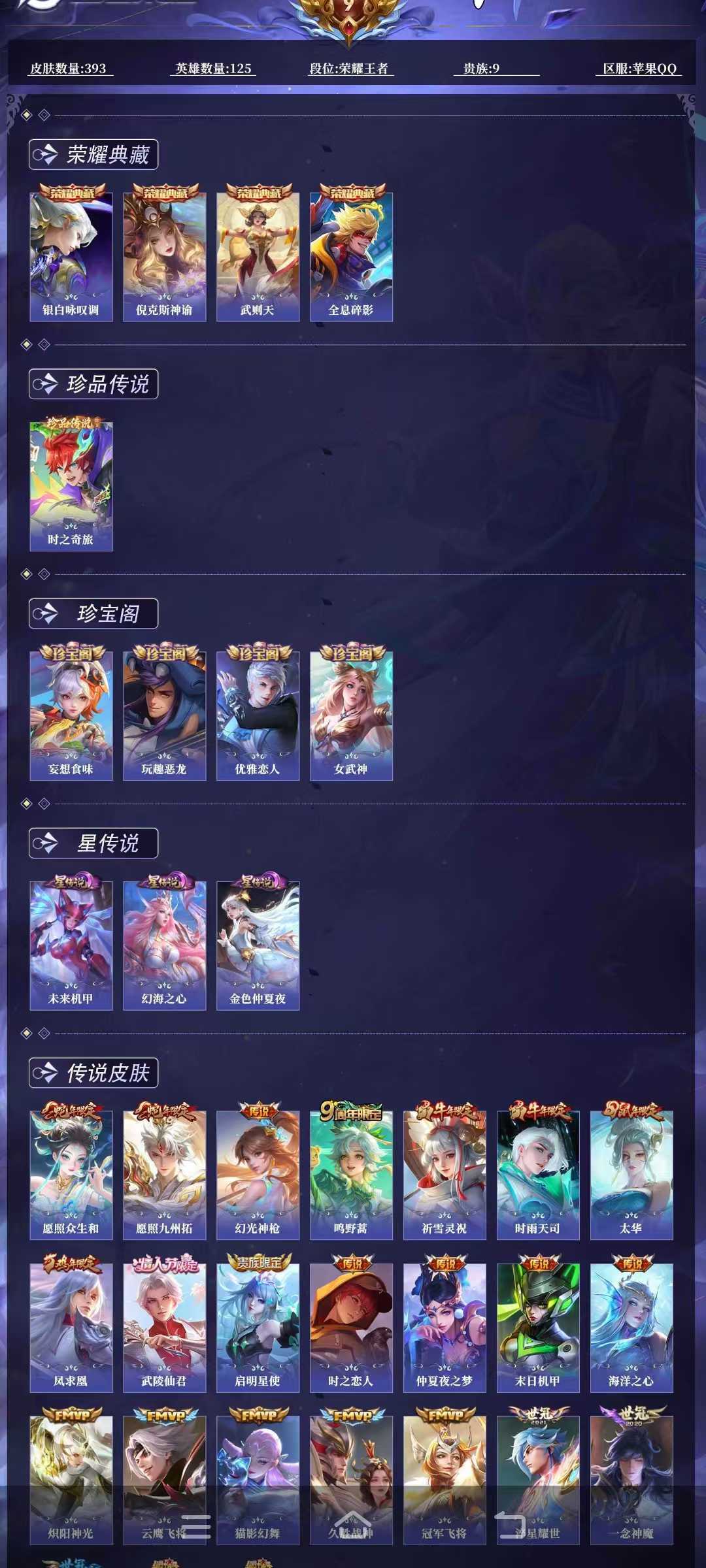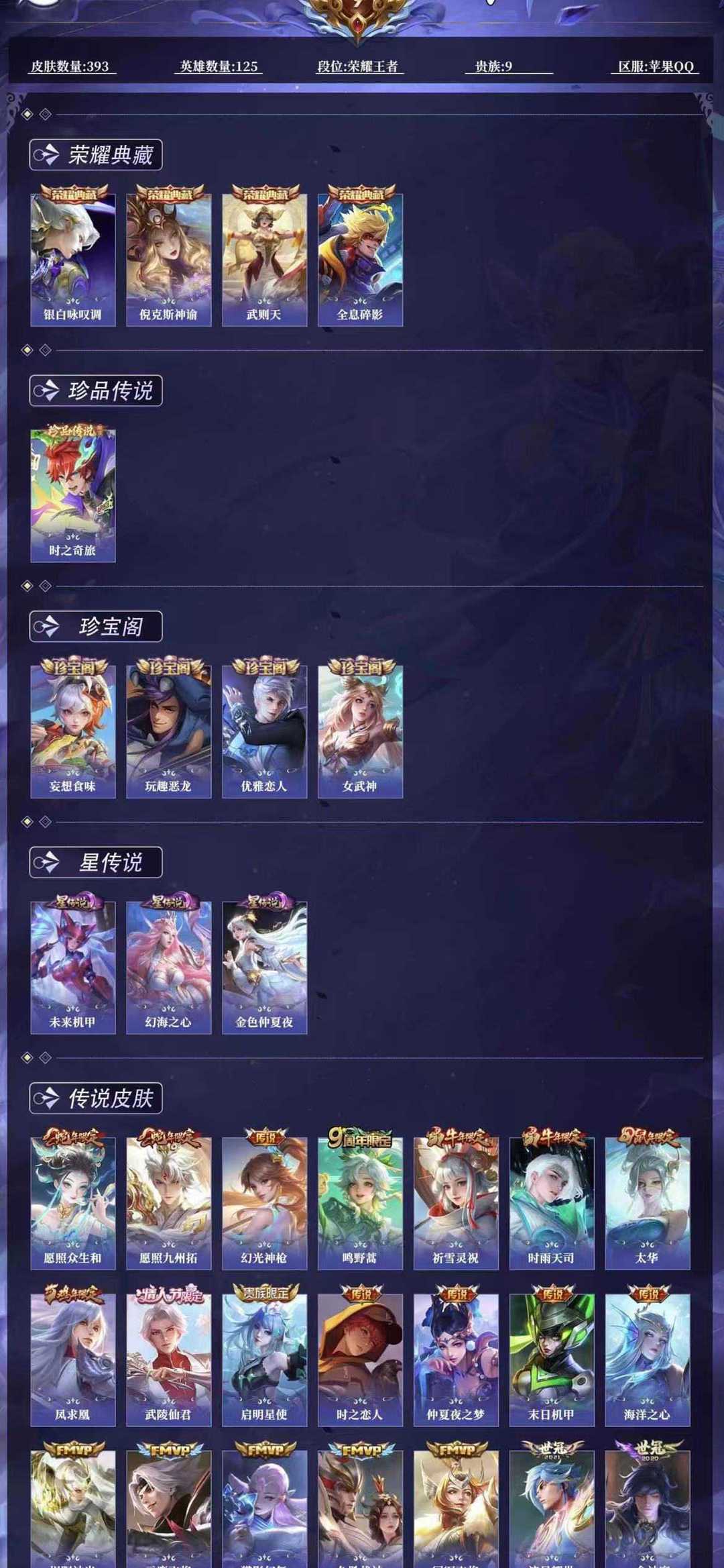 V9用户基础段位:英雄多皮肤多。典藏皮肤3个感受典藏皮肤带来的优质体验快感✨武则天全息碎影1珍品传说3珍品阁24传说115史诗皮❤️非账号问题恶意撤单使用bug手段再上号开游戏者永久拉黑❗❗❗