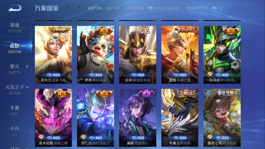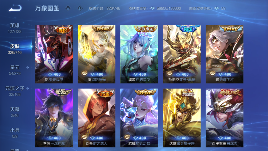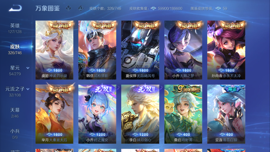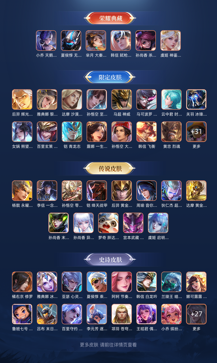 苹果Q-V10-326皮肤-6典藏-2无双-29传说 【典藏】弑枪猎影,宣太后,杀手,无限飓风号,天鹅之梦,神鉴启示录 【无双】碎月剑心,时之魔女 【传说】艾琳觅芳踪,百里玄策白虎志,典韦战鼓燎原,貂蝉猫影幻舞,达摩黄金狮子座,狄仁杰超时空战士,宫本武藏地狱之眼,花木兰冠军飞将,后羿黄金射手座,镜炽阳神光,铠琥珀纪元,铠绛天战甲,澜逐花归海,李信一念神魔,刘备时之恋人,马超琥珀纪元,梦奇胖达荣荣,孙尚香乘龙问璇玑,孙策乘龙淬吴钩,孙尚香异界灵契,孙悟空零号赤焰,孙尚香末日机甲,亚连落雪白狼,虞姬启明星使,曜云鹰飞将,杨戬永曜之星,桑启鸣野蒿,赵云乘龙铭钟鼎,周瑜音你心动 【限定皮肤】:阿轲迷踪丽影,艾琳觅芳踪,安琪拉乘龙聚宝船,百里玄策白虎志,百里玄策原初追逐者,曹操天狼征服者,程咬金演武夺筹,曹操夜都魔契,程咬金群星魔术团,狄仁杰阴阳师,典韦蓝屏警告,狄仁杰魔术师,狄仁杰万华元夜,达摩星际陆战队,达摩沙漠行僧,盾山御銮,妲己灵卜魔法,大乔乘龙忆丹青,关羽冰锋战神,鬼谷子原初探秘者,鬼谷子五谷丰年,公孙离蜜橘之夏,高渐离燃音魔法,鬼谷子天穹祈灯,韩信飞衡,花木兰默契交锋,后羿辉光之辰,