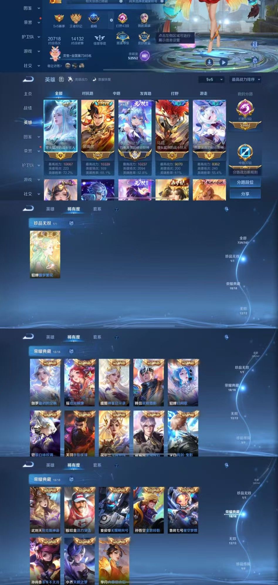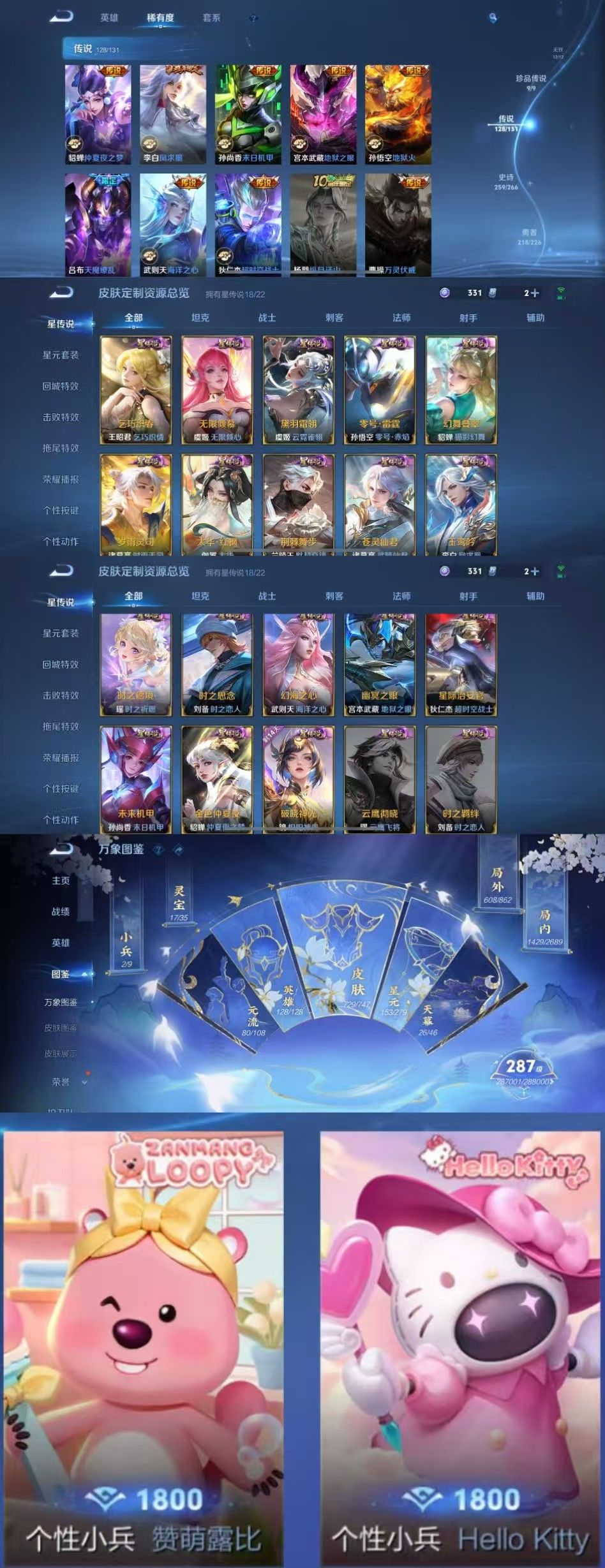 禁止乱用搓搓跟亲密道具!!!号主会一直看着道具流水,乱用秒顶!!!时间到了还登录白玩或者顶号全部改密拉黑处理永不解除,顶号机器会秒禁玩改密,顶号不仅拉黑还没得玩,赚三两块不容易,请理解谢谢。 ❤❤❤❤❤❤❤❤❤❤❤❤❤❤❤❤❤❤❤ 请勿开挂,挂机,送头,骂人,撤单后游戏等如有违规永久拉黑永不解除。 重置二级密码不要费劲了,号主每天都会上号查看,多行不义必自毙,人在做天在看,多做好事多自律,少做缺德事。 该号英雄128个皮肤729个,珍品无双1个,典藏21个,无双12个,珍品传说9个,星传说18个,传说128个,史诗259个,祝您游戏愉快~