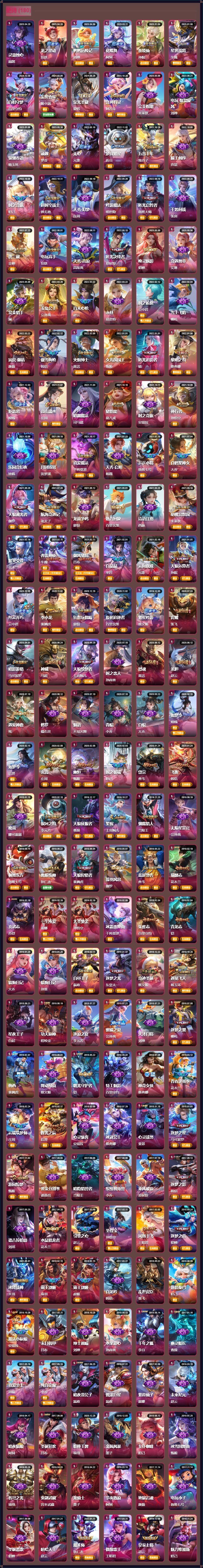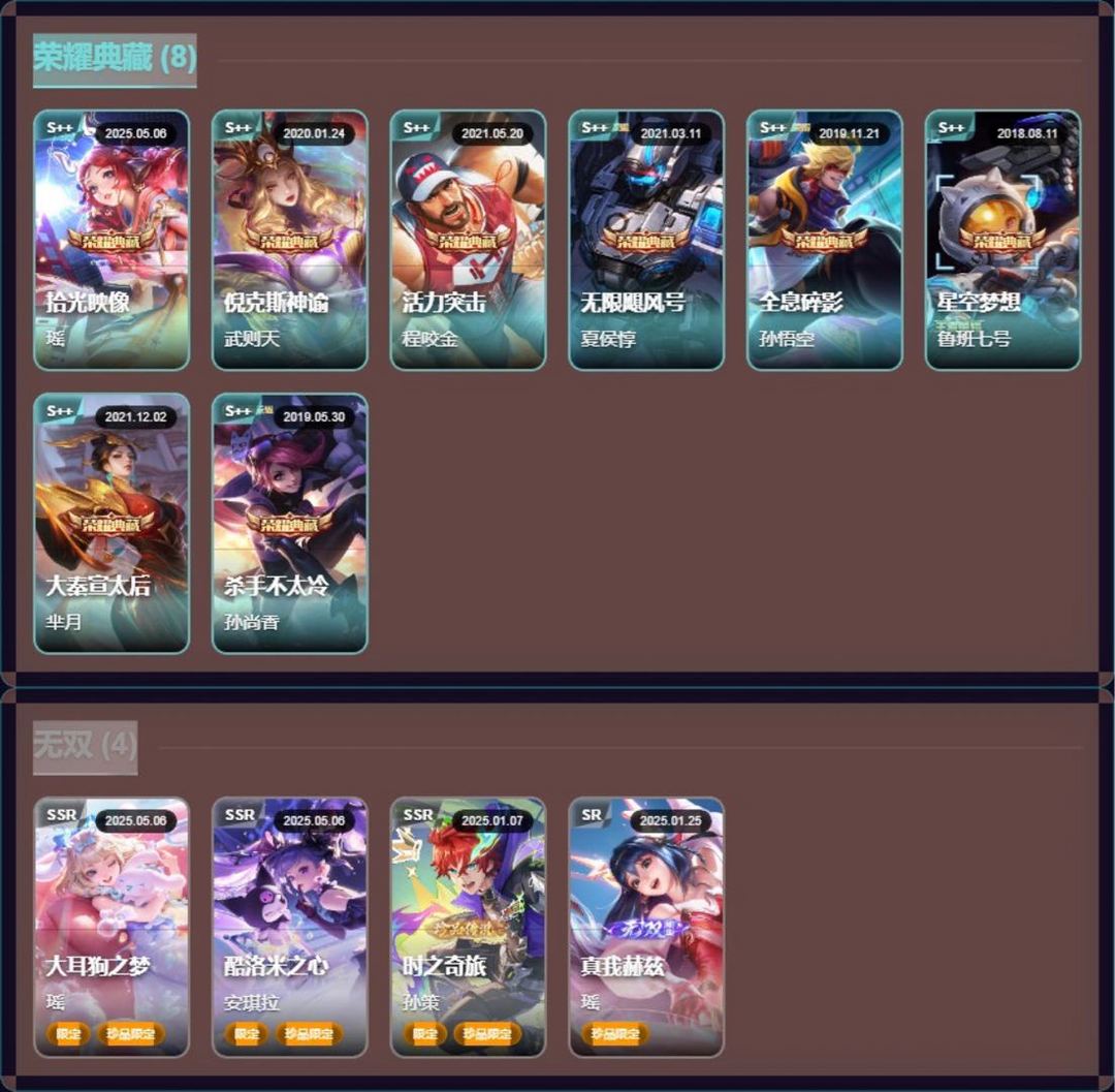 纯白花嫁/天魔缭乱/至尊宝/真爱至上/热情桑巴/梅西/青龙志/白虎志/朱雀志/久胜战神/飞衡/匿光追影者/真我赫兹(瑶)/无双飞将/时之祈愿瑶/李逍遥/逐花归海/武圣/鹤羽星尊/时之奇旅(孙策)/拾光映像/大耳狗之梦/深海之息/玉兔公主/异界灵契/神威/炽阳神光/酷洛米之心/傲雪梅枪/时雨天司/纯白花嫁/天魔缭乱/至尊宝/真爱至上/热情桑巴/梅西/青龙志/白虎志/朱雀志/久胜战神/飞衡/匿光追影者/真我赫兹(瑶)/无双飞将/时之祈愿瑶/李逍遥/逐花归海/武圣/鹤羽星尊/时之奇旅(孙策)/拾光映像/大耳狗之梦/深海之息/玉兔公主/异界灵契/神威/炽阳神光/酷洛米之心/傲雪梅枪/时雨天司