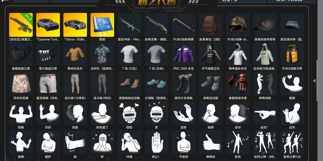 - 角色: 布加迪跑车√妖魔之触ACE√夏日渔夫帽√AKM√M762√M
