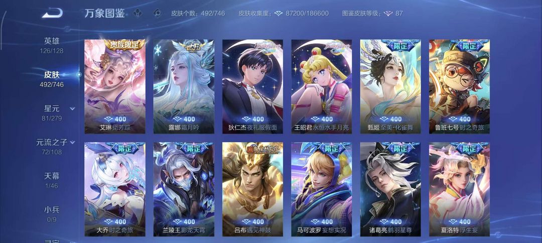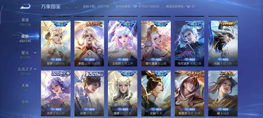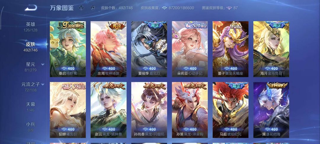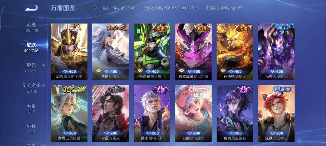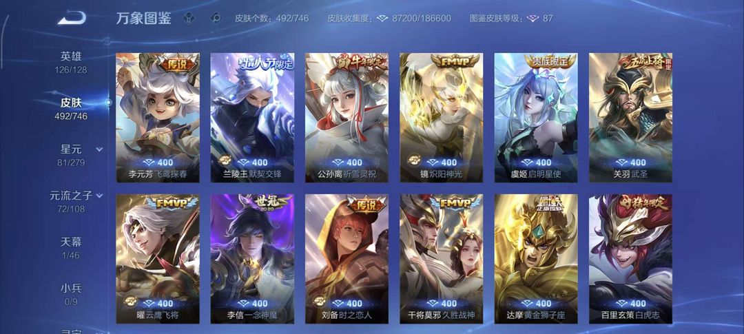 贵族等级V10段位最强王者英雄数量125典藏皮肤数3皮肤数量462纯白花嫁/天魔缭乱/至尊宝/热情桑巴/梅西/青龙志/白虎志/朱雀志/久胜战神/飞衡/匿光追影者/赤影疾锋/无双飞将/时之祈愿瑶/李逍遥/武圣/深海之息/玉兔公主/补天/异界灵契/神威/炽阳神光/启示之音/傲雪梅枪/时雨天司/纯白花嫁/天魔缭乱/至尊宝/热情桑巴/梅西/青龙志/白虎志/朱雀志/久胜战神/飞衡/匿光追影者/赤影疾锋/无双飞将/时之祈愿瑶/李逍遥/武圣/深海之息/玉兔公主/补天/异界灵契/神威/炽阳神光/启示之音/傲雪梅枪/时雨天司