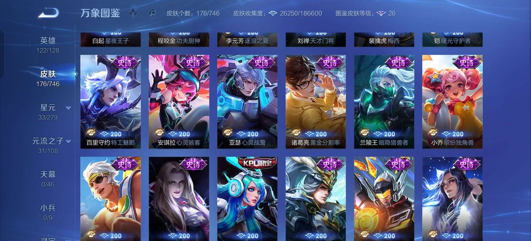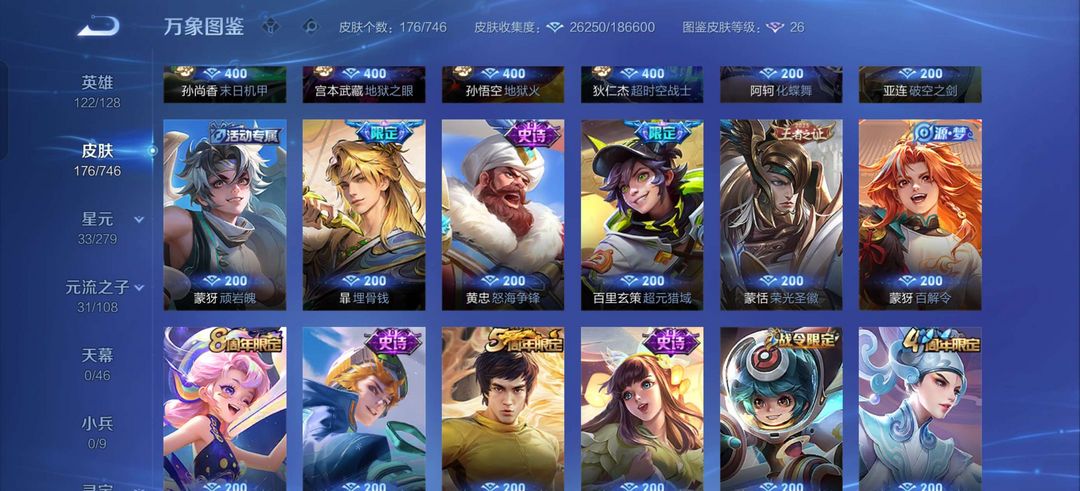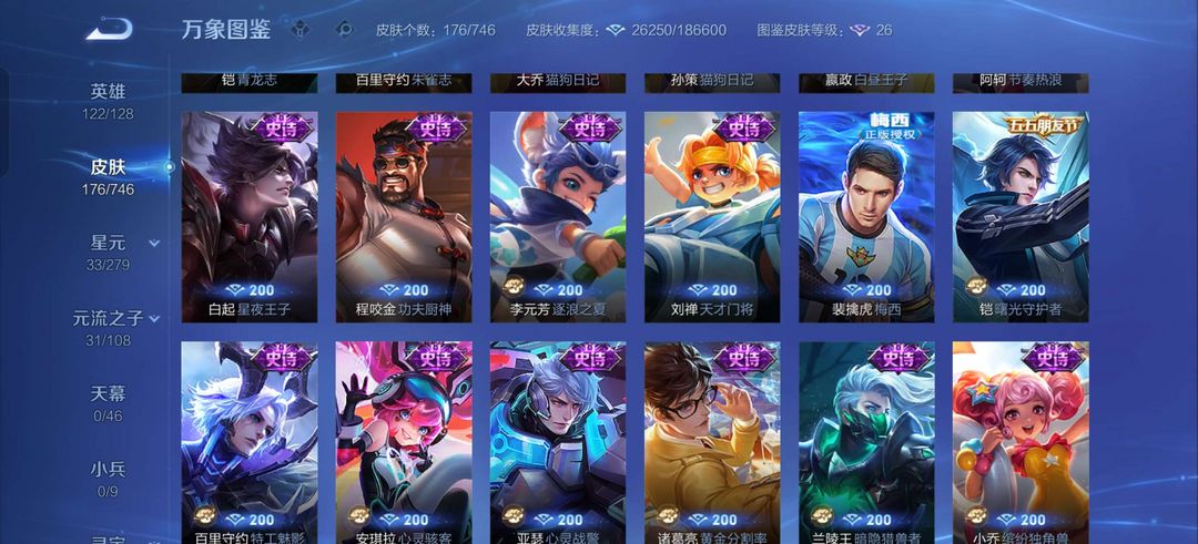 贵8 176款皮肤及122英雄。绝版限定【裴擒虎-梅西】,并包含黄金白羊座、地狱之眼、白虎志、大圣娶亲等多款热门传说及限定皮肤。图鉴等级26,账号稳定。
