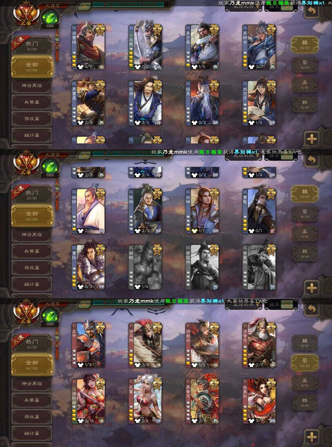 【免费点将】v13大将军曹髦⚡动态刘焉神荀彧神郭嘉神甘宁⚡界沮授⚡杜预⚡动态界钟会⚡文鸯⚡谋黄忠⚡孙寒华⚡ 魏:谋曹贼 文鸯 界钟会 曹髦 戏志才 蜀:谋马超 谋黄忠 谋孙尚香 吴:孙寒华 留赞 界徐盛 群:杜预 界沮授 动态刘焉 神:动态神甘宁 动态神郭嘉 动态神荀彧