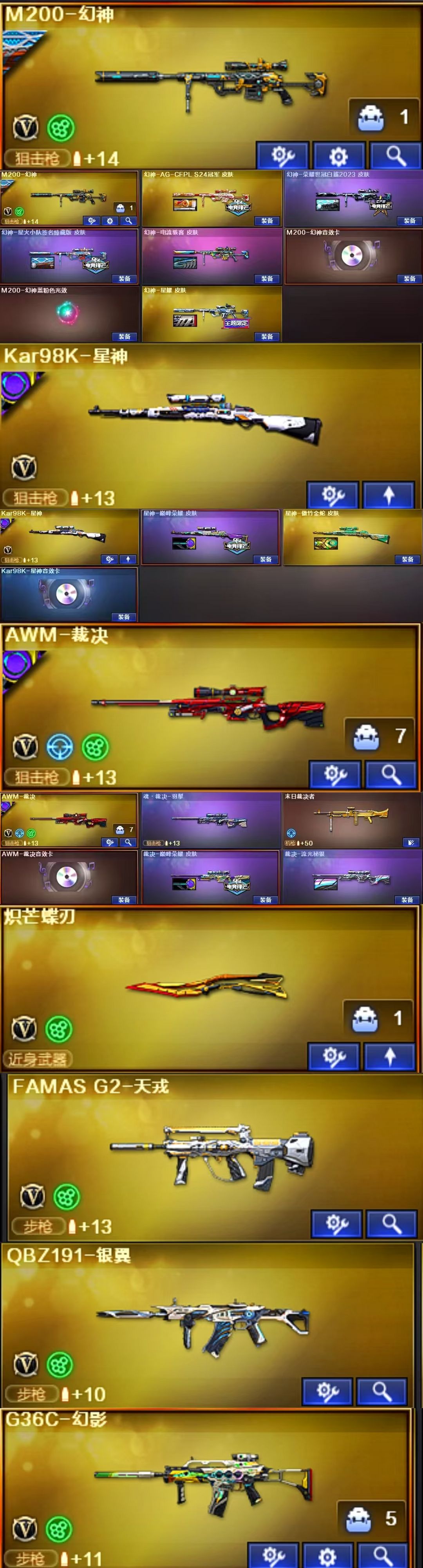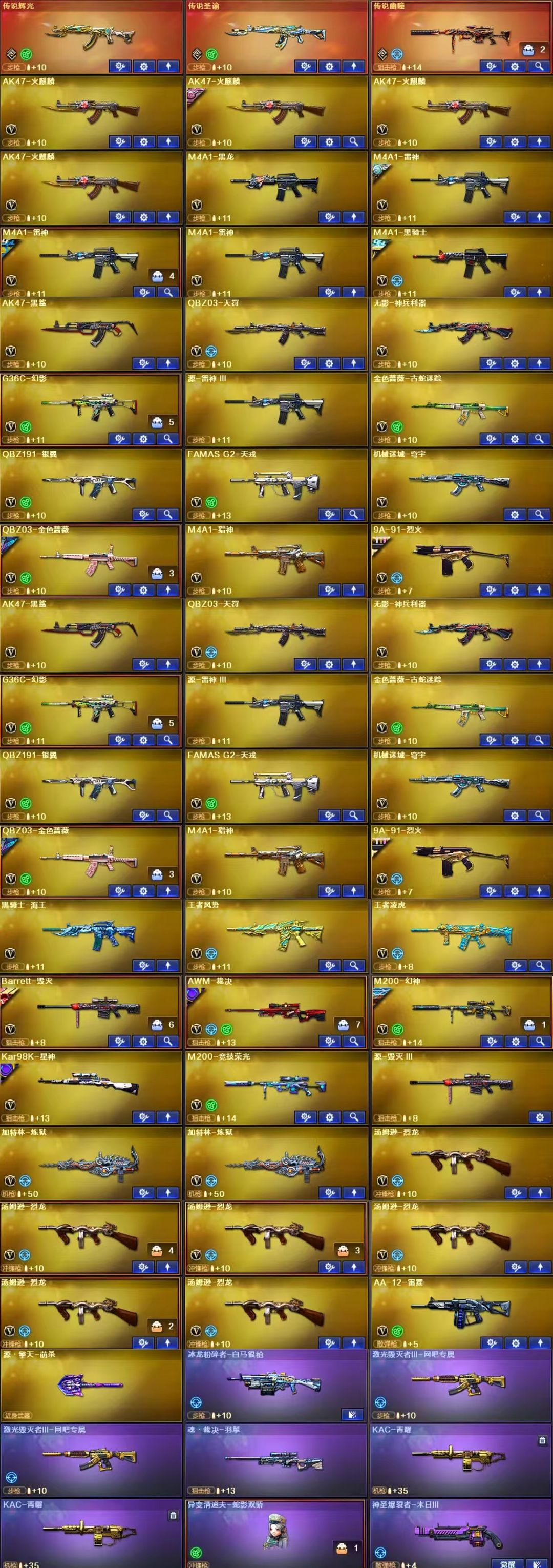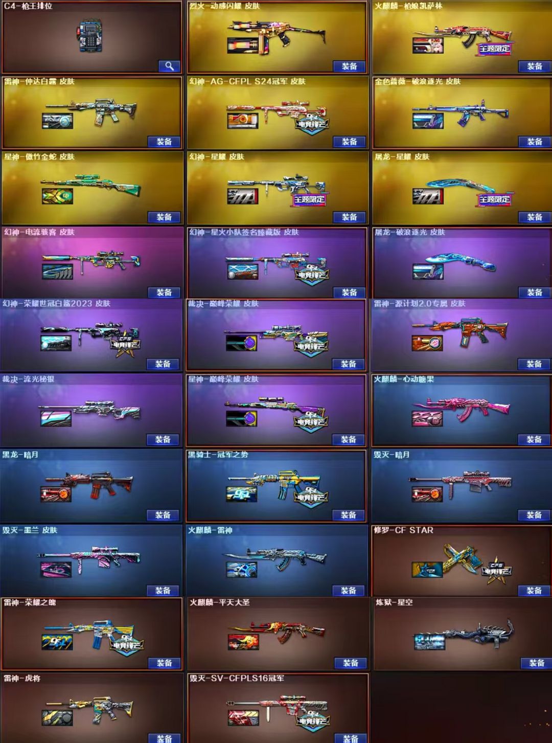 王者武器:王者凌虎;雷霆王者之锋-觉醒版;王者风势-觉醒版;COP 357-雷霆王者-觉醒版;高爆手雷-雷霆王者;烟雾弹-雷霆王者-觉醒版;闪光弹-雷霆王者-觉醒版 英雄武器:汤姆逊-烈龙;高爆手雷-玄豹;烟雾弹-玄豹;闪光弹-玄豹;Anaconda-玄豹;加特林-炼狱;M4A1-黑龙;USP-冥王;丛林匕首-玄豹;机械迷城-穹宇;传说圣谕;AA-12-雷霆;FAMAS G2-天戎;QBZ03-天罚;M4A1-猎神;沙鹰-天神;M4A1-雷神;M4A1-黑骑士;USP-雷暴;柯尔特-冠军之特;柯尔特-荣耀世冠白鲨2023;M200-幻神;G36C-幻影;黑骑士-海王;9A91-烈火;AK47-火麒麟;传说辉光;柯尔特-竞技荣光;QBZ03-金色蔷薇;Kar98K-星神;AWM-裁决;闪光弹-竞技荣光;炽芒蝶刃;高爆手雷-竞技荣光;沙鹰-修罗;传说幽瞳;无影-神兵利器;麒麟刺;M200-竞技荣光;AK47-黑鲨;龙啸;擎天;屠龙;Barrett-毁灭 角色:零;星际战将;传说星骇;猎狐者;飞虎队;刀锋;潘多拉;堕天使;夜玫瑰;精英部队;灵狐者-黄金海岸;影武者-X;铁面-网吧专属;剑齿虎