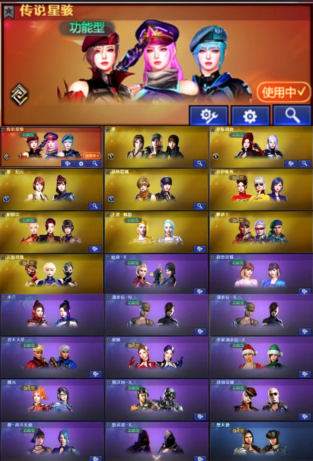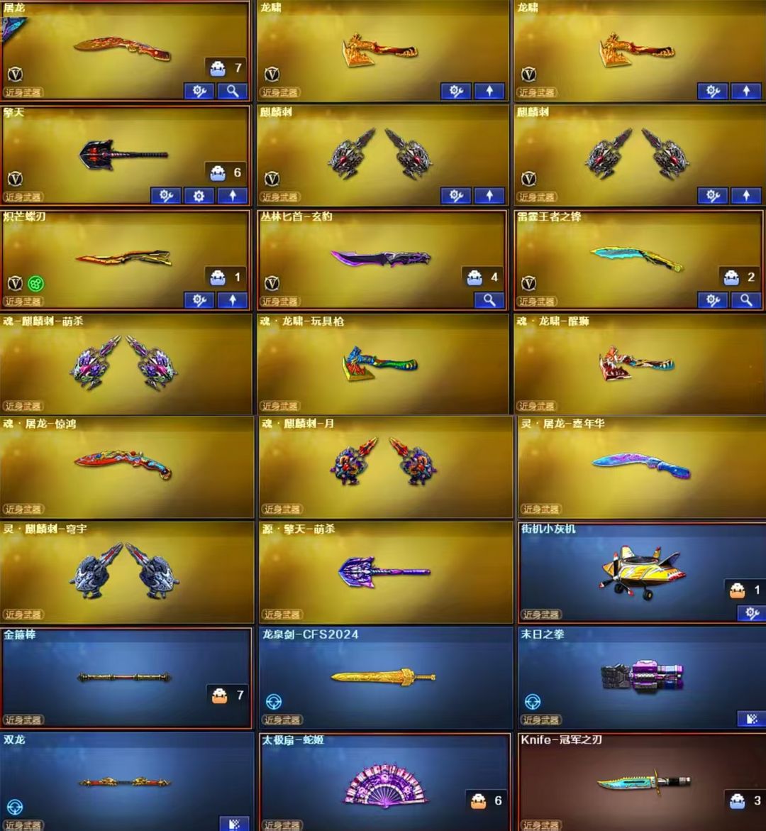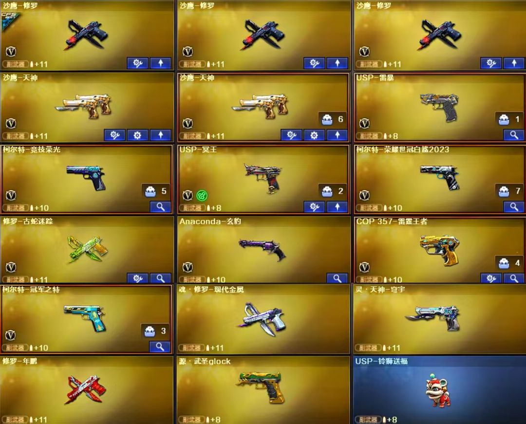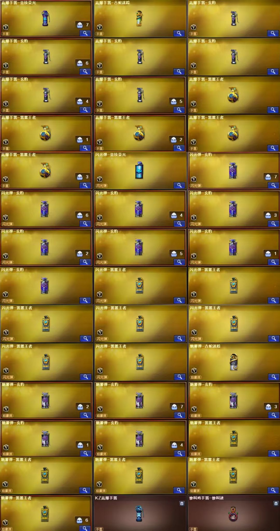 王者武器:王者凌虎;雷霆王者之锋-觉醒版;王者风势-觉醒版;COP 357-雷霆王者-觉醒版;高爆手雷-雷霆王者;烟雾弹-雷霆王者-觉醒版;闪光弹-雷霆王者-觉醒版 英雄武器:汤姆逊-烈龙;高爆手雷-玄豹;烟雾弹-玄豹;闪光弹-玄豹;Anaconda-玄豹;加特林-炼狱;M4A1-黑龙;USP-冥王;丛林匕首-玄豹;机械迷城-穹宇;传说圣谕;AA-12-雷霆;FAMAS G2-天戎;QBZ03-天罚;M4A1-猎神;沙鹰-天神;M4A1-雷神;M4A1-黑骑士;USP-雷暴;柯尔特-冠军之特;柯尔特-荣耀世冠白鲨2023;M200-幻神;G36C-幻影;黑骑士-海王;9A91-烈火;AK47-火麒麟;传说辉光;柯尔特-竞技荣光;QBZ03-金色蔷薇;Kar98K-星神;AWM-裁决;闪光弹-竞技荣光;炽芒蝶刃;高爆手雷-竞技荣光;沙鹰-修罗;传说幽瞳;无影-神兵利器;麒麟刺;M200-竞技荣光;AK47-黑鲨;龙啸;擎天;屠龙;Barrett-毁灭 角色:零;星际战将;传说星骇;猎狐者;飞虎队;刀锋;潘多拉;堕天使;夜玫瑰;精英部队;灵狐者-黄金海岸;影武者-X;铁面-网吧专属;剑齿虎