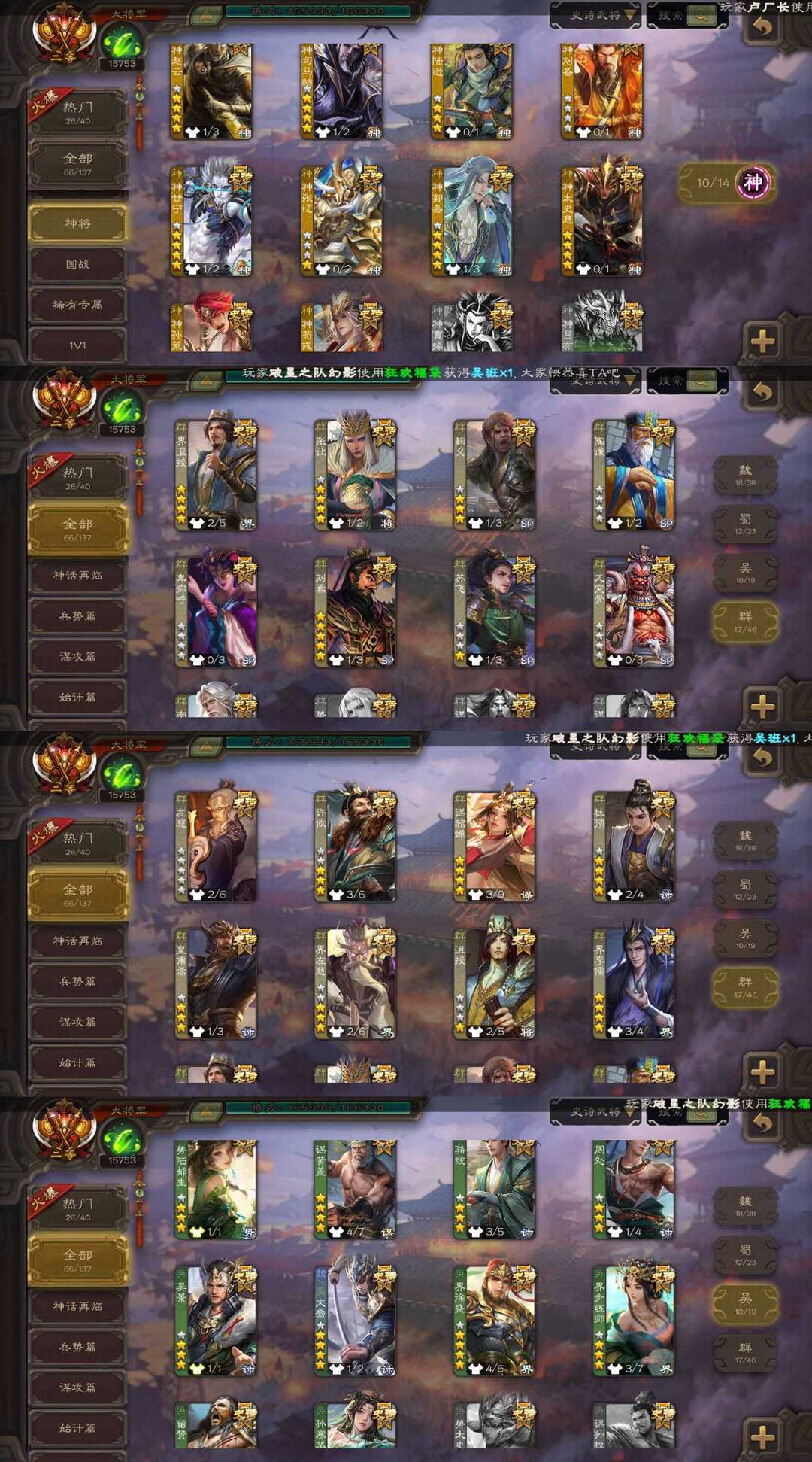 【免费点将】v14◆动态刘焉神司马懿神甘宁神郭嘉神荀彧势董昭◆曹髦势陆郁生◆动态文鸯奇门孙寒华◆界沮授◆ 魏:谋曹仁 势董昭 动态文鸯 动态界钟会 王元姬 曹髦 戏志才 蜀:谋黄忠 谋马超 谋赵云 界黄忠 吴:势陆郁生 谋黄盖 孙寒华 界徐盛 留赞 群:界沮授 谋貂蝉 杜预 皇莆嵩 刘焉 南华老仙 神:神司马懿 神甘宁 神荀彧 神孙策 神太史慈 神刘备