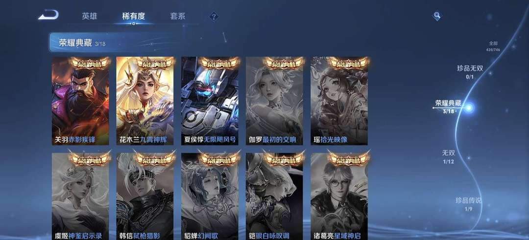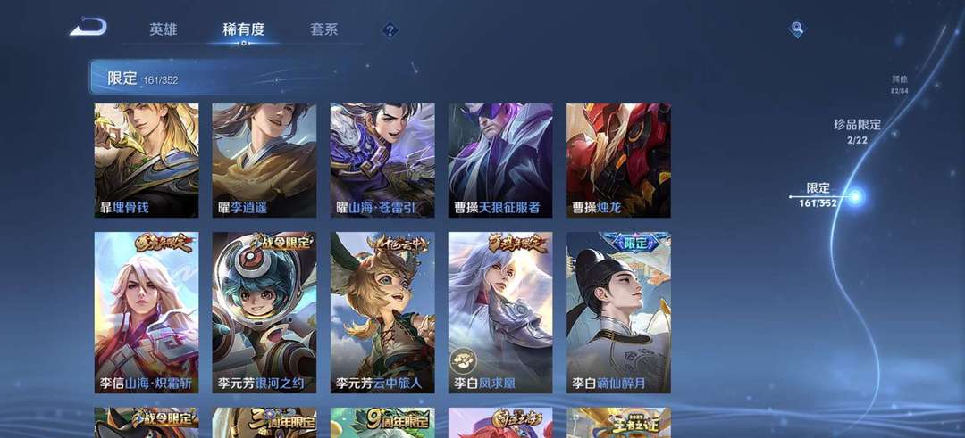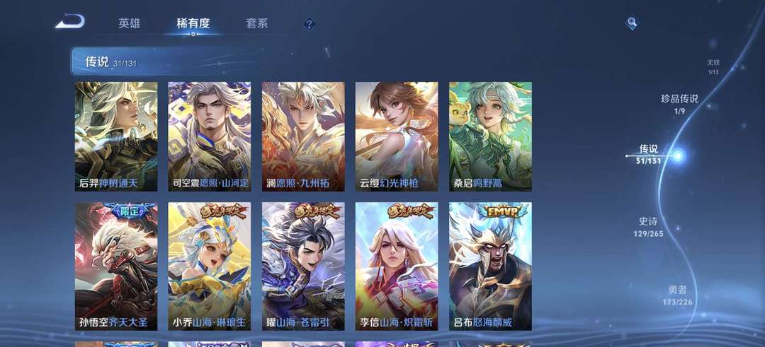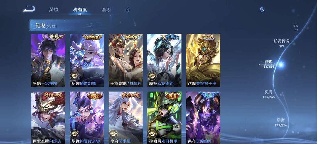 3典藏,1无双,31传说,典藏有花木兰,夏侯惇,关羽,耀的无双,老虎有梅西,玄策有白虎,吕布有天魔,李白有凤求凰,