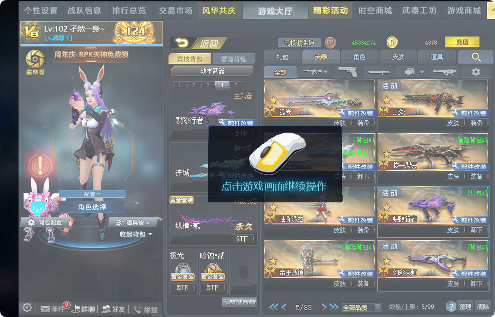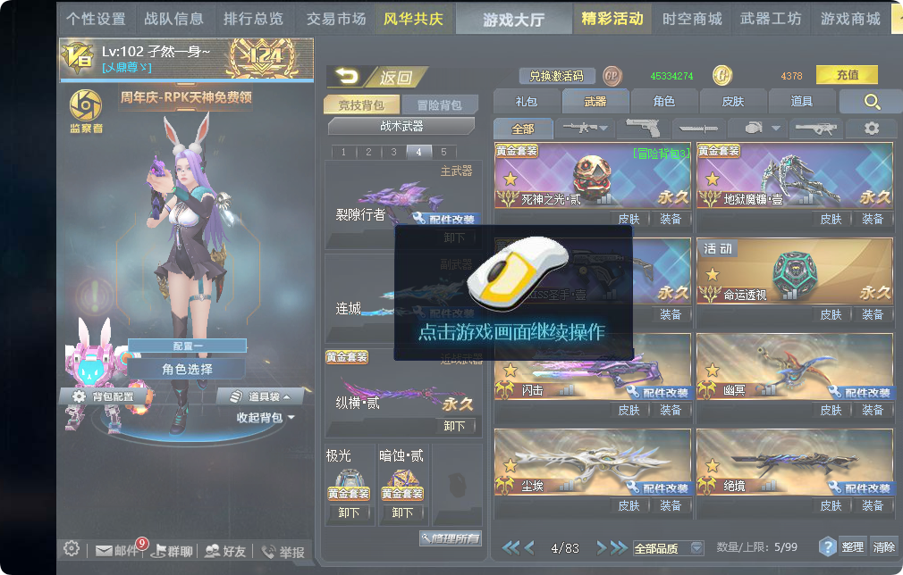 武器: 神谕典藏1900符文416,飞梭典藏1800,纵横典藏1800(附魔皮),龙息终焉3配,两仪1650,天枢典藏1225,玉衡1225,万象725,弧光1725,连城1725,核子1725,战锤1700,轮回1700,夜枭1725,末世1725,玄天1675,还有裂隙,伏虎,幽冥,尘埃,闪击,黑炎4配件等等,裁决符文258,撼天二,广陵,命运透视,无暇,数据魔方。无限,屠魔,幻峰23配,以及一些老武器 角色饰品:魔童,妖猫,犀牛,青山牛王,罐子头,丧钟,金刚伞飞虎爪摸金符都是史诗 资源:雪糕币3791