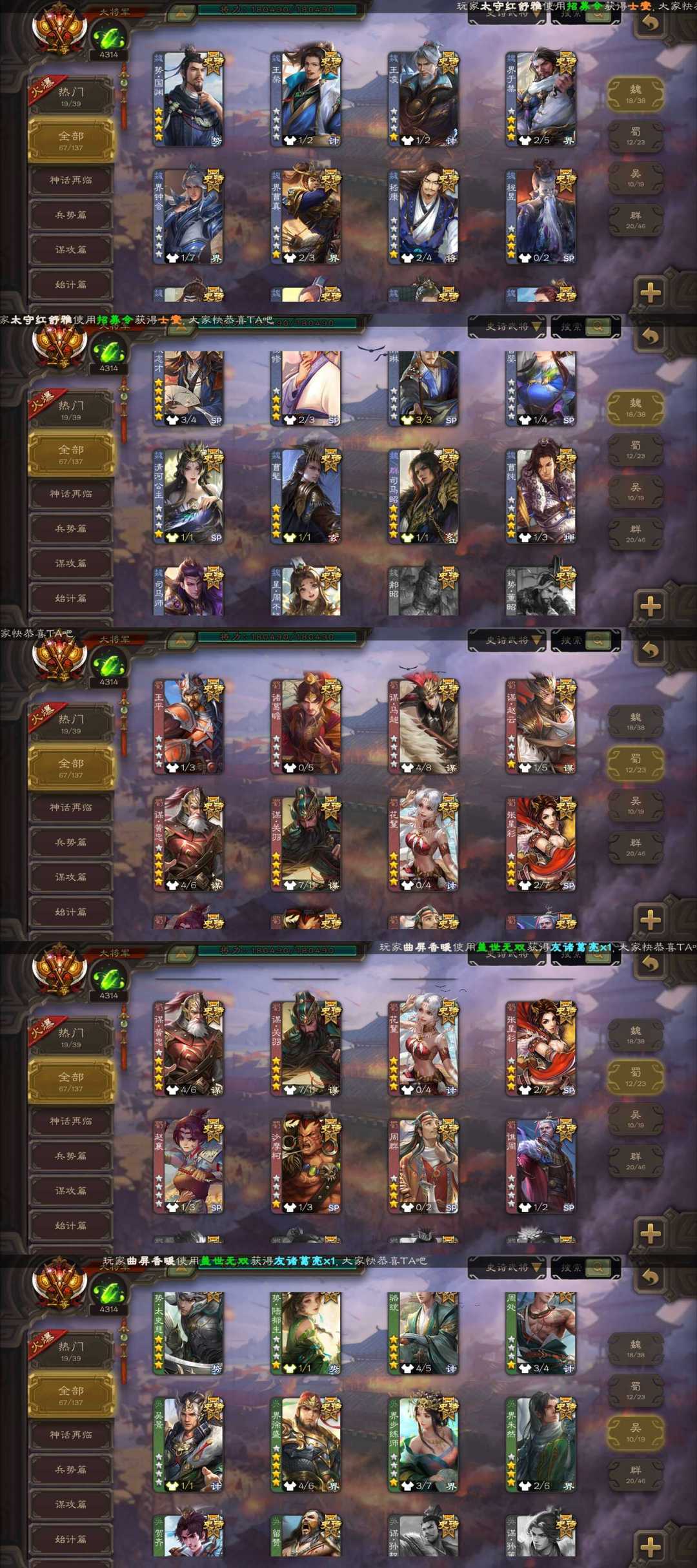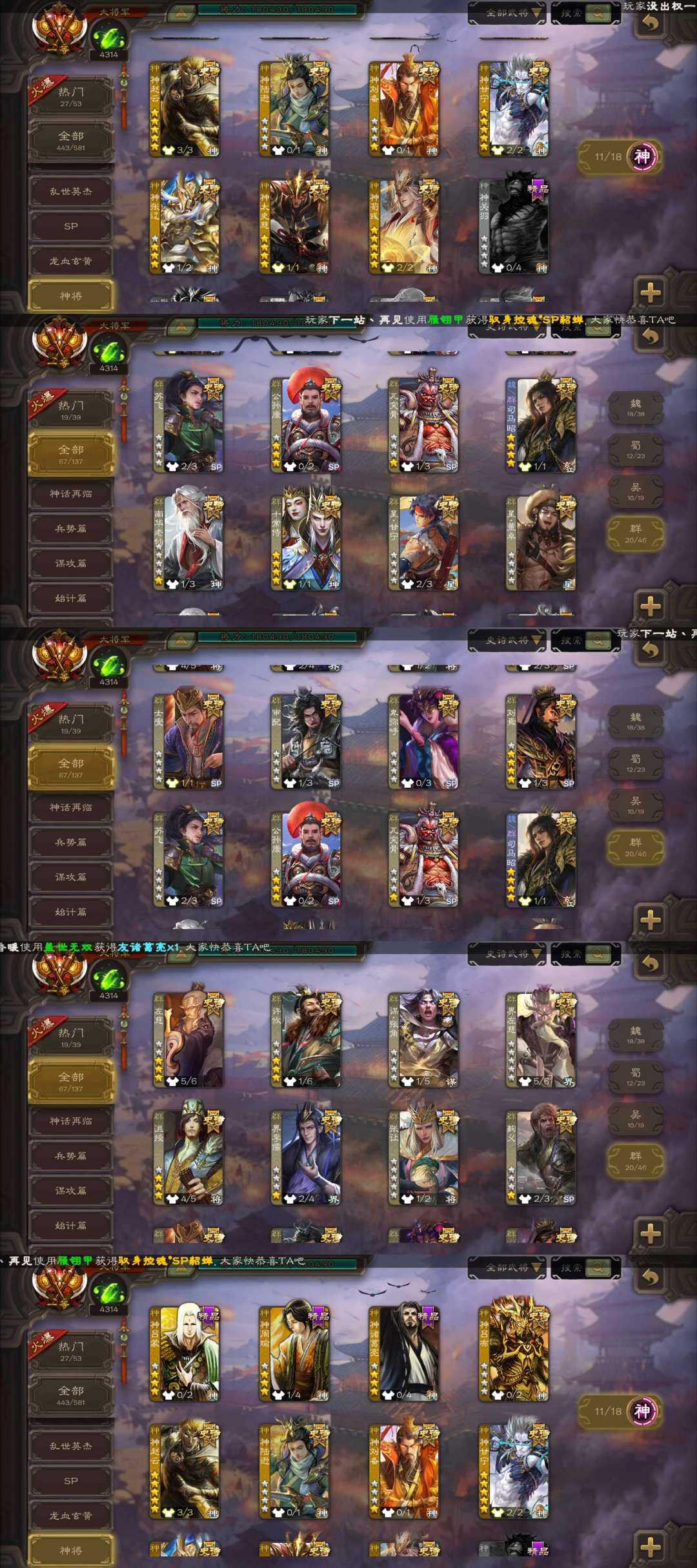 一等大将军四巨头新皮大将军枭龙破渊双形态动态曹髦/龙兴蜀川动态刘焉/朝华同袍动态十常侍/潜蛟觊天双形态动态界钟会/动态神荀彧/双动皮神甘宁/鳞振九霄回廊神赵云/势国渊/势太史慈/落笔生花动态骆统/烈箭贯云谋黄忠/以身证道谋关羽/动态势陆郁生/动态司马昭/冠绝天下南华老仙等67史诗66动态皮肤,有金皮友徐庶,动态谋黄月英,动态阎象,势杨弘,鲍信,谋贾诩,动态谋郭嘉等强力精品