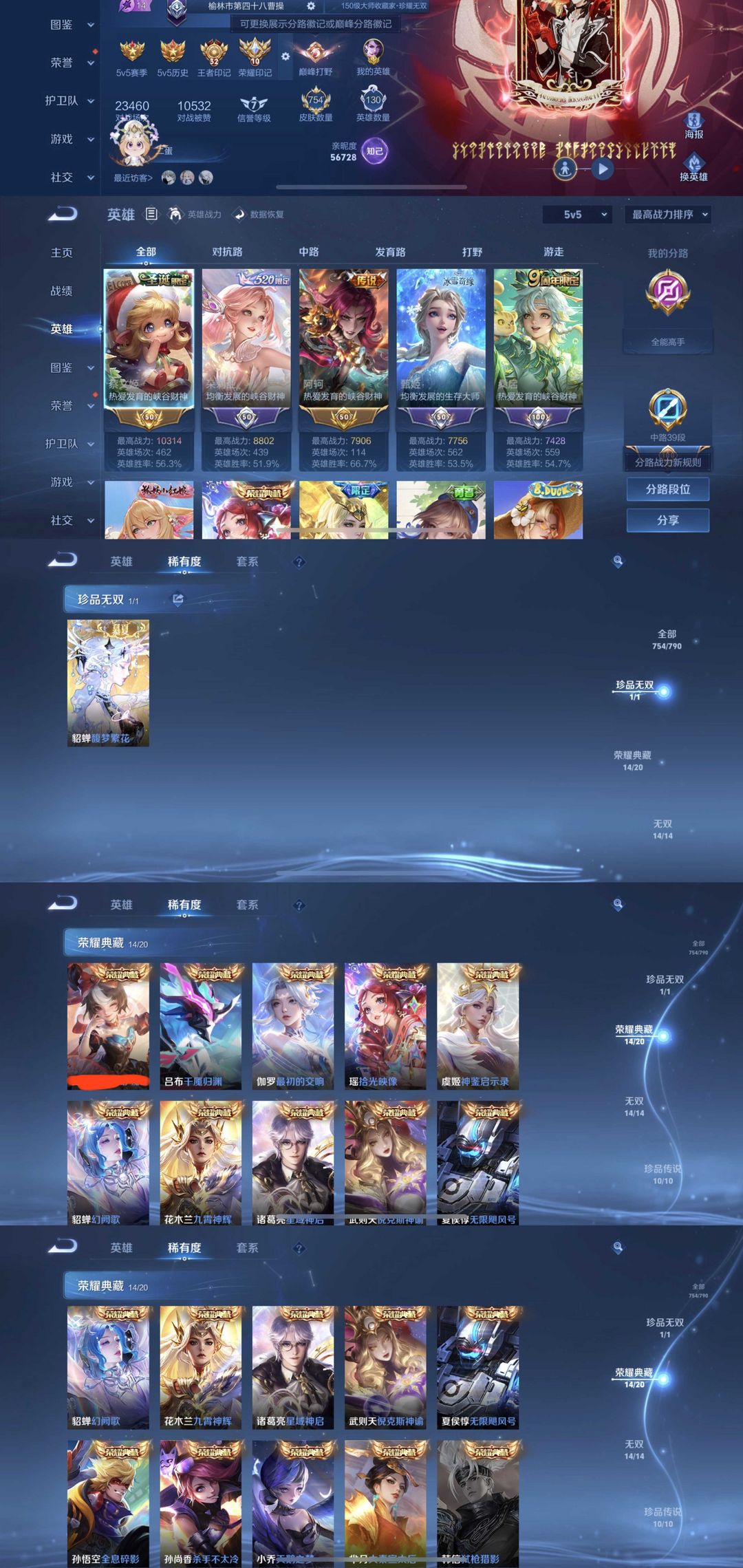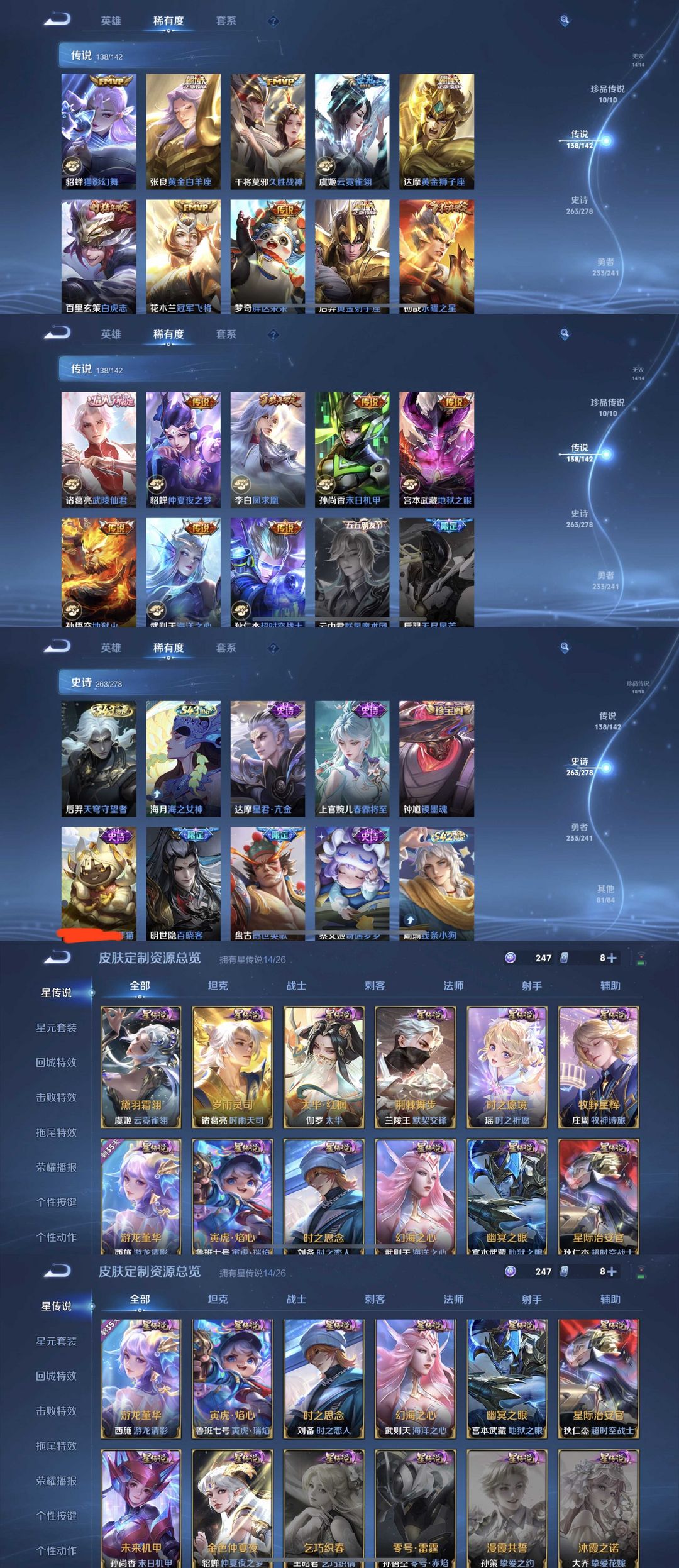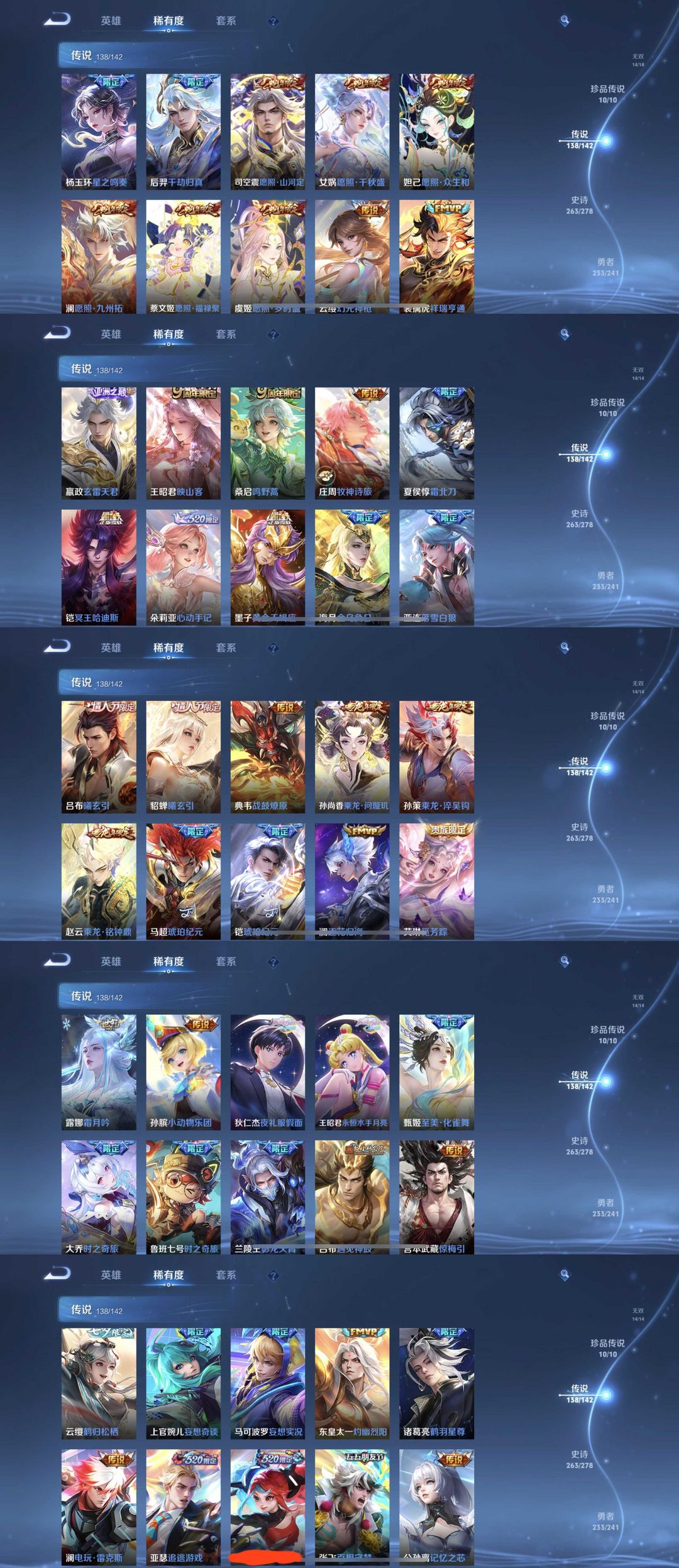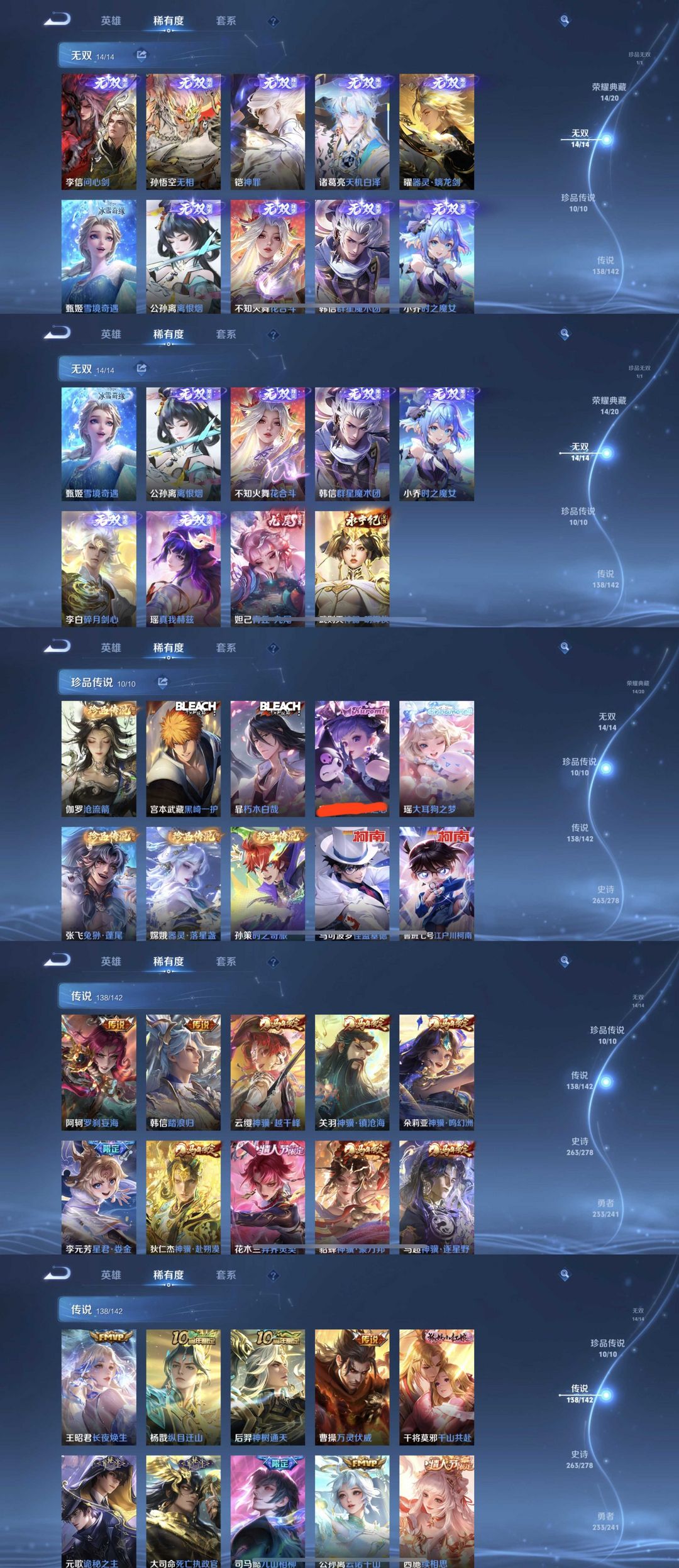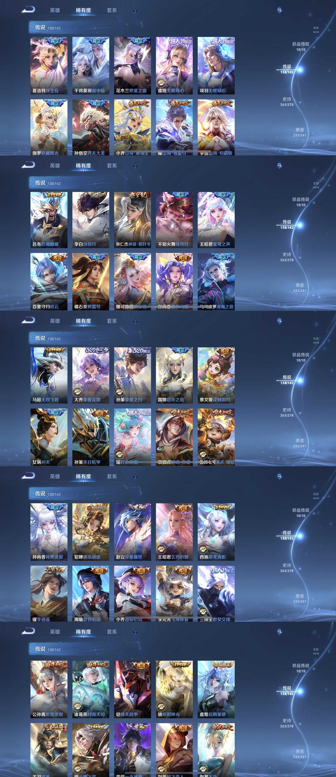 该号英雄130个皮肤754个,珍品无双1个,典藏15个,无双10个,珍品传说10个,星传说14个,传说138个,史诗263个,祝你游戏愉快~