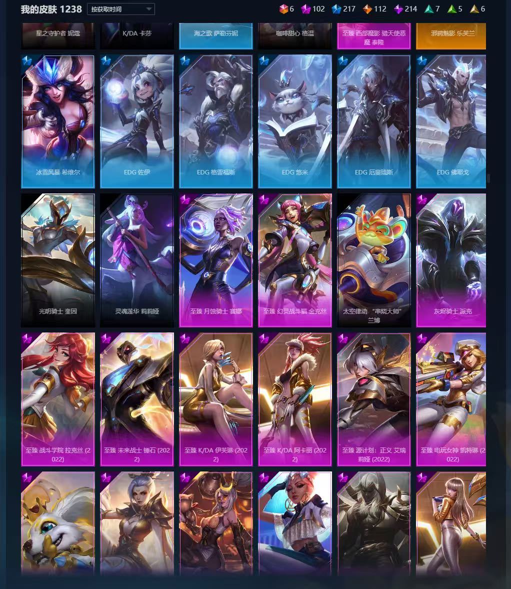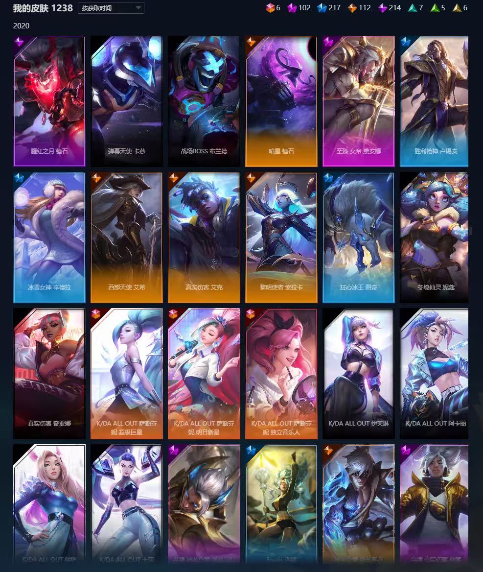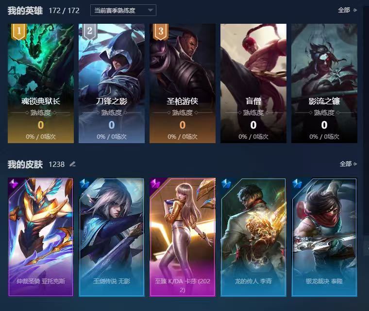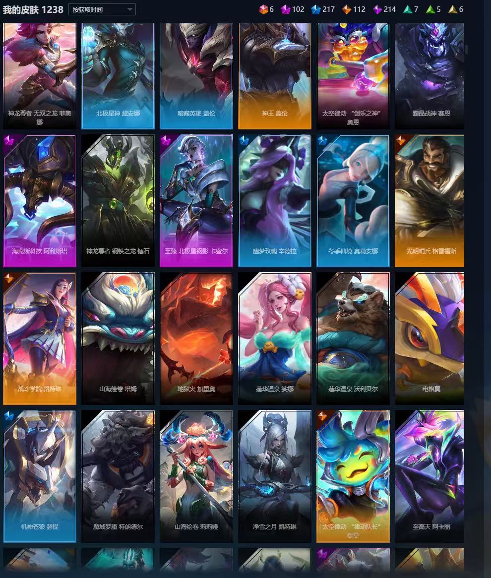 满英雄,1238皮肤另有炫彩,各种限定套,年限。无段位。自己看,不一一介绍,几乎每个英雄都有皮肤。禁止利用账号进行开挂、使用辅助违规软件诈骗等违规操作。毁号行为涉及毁坏虚拟财产罪及计算机安全罪,请文明游戏素质游戏,让我们共建美好租号平台!