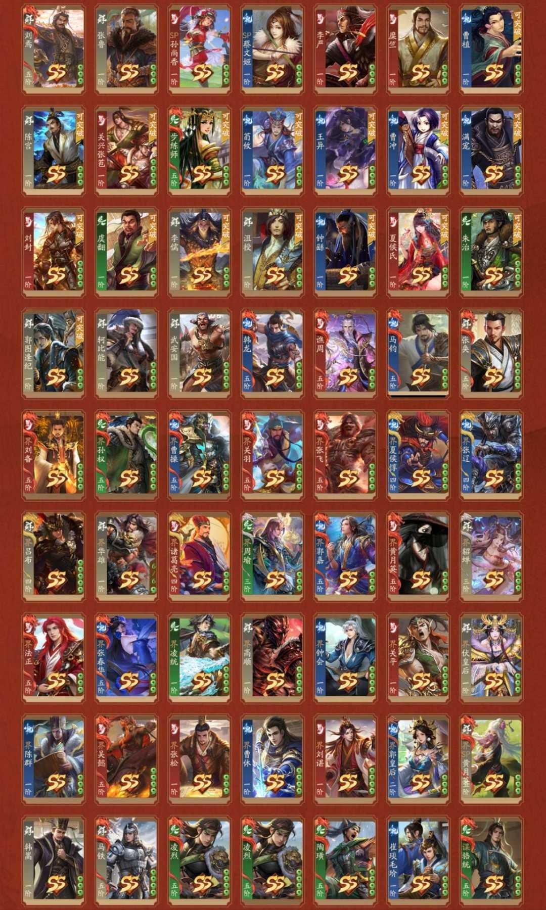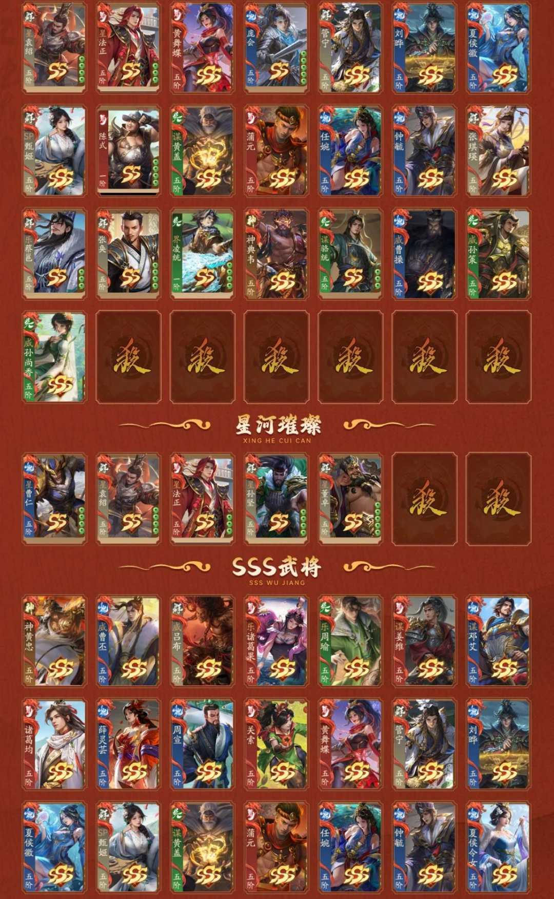 2神武,1大谋,4谋,3乐,5威,36阴间,5星河,【阴间】:神黄忠(动),威曹丕,威吕布,乐诸葛果(静),乐周瑜,谋姜维,谋邓艾,诸葛均,庞宏,袁胤(静),薛灵芸(静),周宣,关索,星曹仁,星袁绍(动),星法正,黄舞蝶(动),庞会,管宁(静),刘晔(静),夏侯徽,SP甄姬,陈式,谋黄盖,蒲元,任婉,钟毓,张琪瑛(静),乐蔡邕,张奂,界凌统,神典韦,谋骆统,威曹操,威孙策,威孙尚香;【神武】:神黄忠(动),神典韦;【大谋】:谋姜维;【谋】:谋邓艾,谋黄盖,谋张绣,谋骆统;【乐】:乐诸葛果(静),乐周瑜,乐蔡邕;【威】:威曹丕,威吕布,威曹操,威孙策,威孙尚香;【星河】:星曹仁,星袁绍(动),星法正,星孙坚,星董卓;【SSS】:神黄忠(动),威曹丕,威吕布,乐诸葛果(静),乐周瑜,谋姜维,谋邓艾,诸葛均,薛灵芸(静),周宣,关索,黄舞蝶(动),管宁(静),刘晔(静),夏侯徽,SP甄姬,谋黄盖,蒲元,任婉,钟毓,夏侯令女,莫琼树(动),曹髦,SP贾诩,王荣,夏侯霸(静),王双,雷铜,黄祖,诸葛恪,陈琳,杨修(动),诸葛果(静),灵雎,辛宪英,王允(静),刘琦,赵昂,来莺儿,杨仪,张宝,管辂