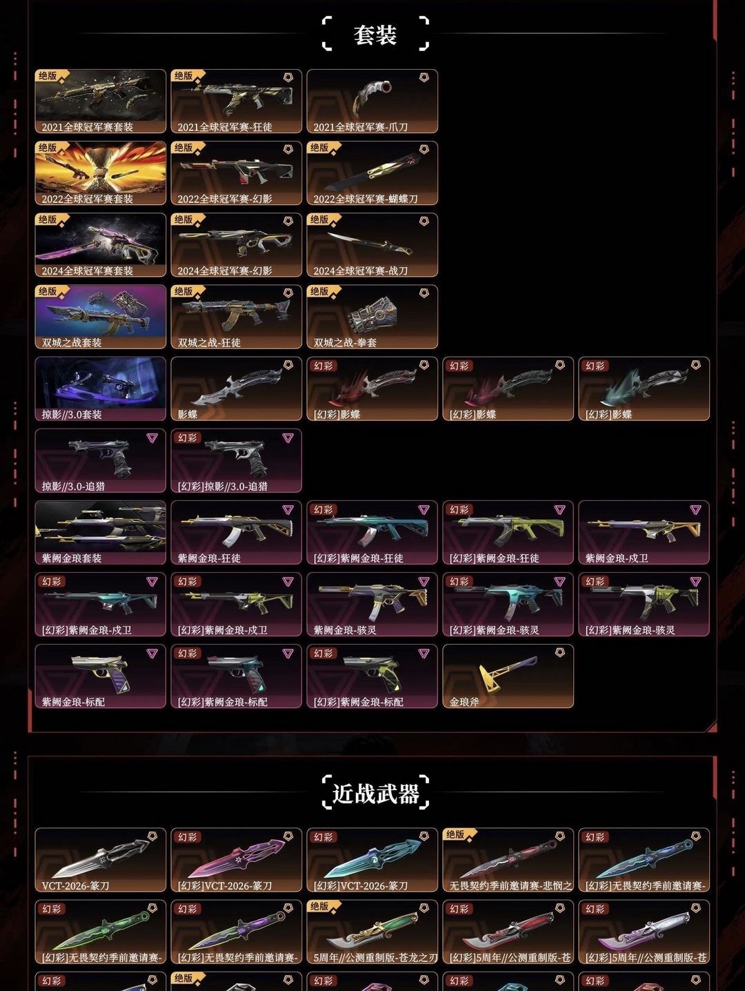 【拥有套装】掠影//3.0套装(掠影//3.0-追猎,影蝶)2022全球冠军赛套装(2022全球冠军赛-幻影,2022全球冠军赛-蝴蝶刀)双城之战套装(双城之战-狂徒,双城之战-拳套)2024全球冠军赛套装(2024全球冠军赛-幻影,2024全球冠军赛-战刀)2021全球冠军赛套装(2021全球冠军赛-狂徒,2021全球冠军赛-爪刀)紫阙金琅套装(紫阙金琅-戍卫,紫阙金琅-狂徒,紫阙金琅-骇灵,紫阙金琅-标配,金琅斧) 【拥有近战武器】VCT-2026-篆刀,无畏契约季前邀请赛-悲悯之刃,5周年//公测重制版-苍龙之刃,VCT-2025-爪刀,超限闪存-匕首,钢轨卫士-战锤,弧光异彩-军刀,合金战车-军刀,离火刃,侦察力量-蝴蝶刀, 【拥有步枪】砰砰X特攻队-幻影,2023全球冠军赛-狂徒,超时空卫队-狂徒,盖亚的复仇-狂徒,超限闪存-幻影,钢轨卫士-狂徒,钢轨卫士-戍卫,噬源兽防卫工程-幻影,弧光异彩-獠犬,弧光异彩-狂徒,合金战车-幻影,模拟赫兹-獠犬,浮光跃金-戍卫,战术小伙伴-獠犬,战术小伙伴-幻影,彩梦之城-戍卫,花漾粉红-戍卫,数码咒术-獠犬, 【拥有狙击枪】归零者-冥驹,