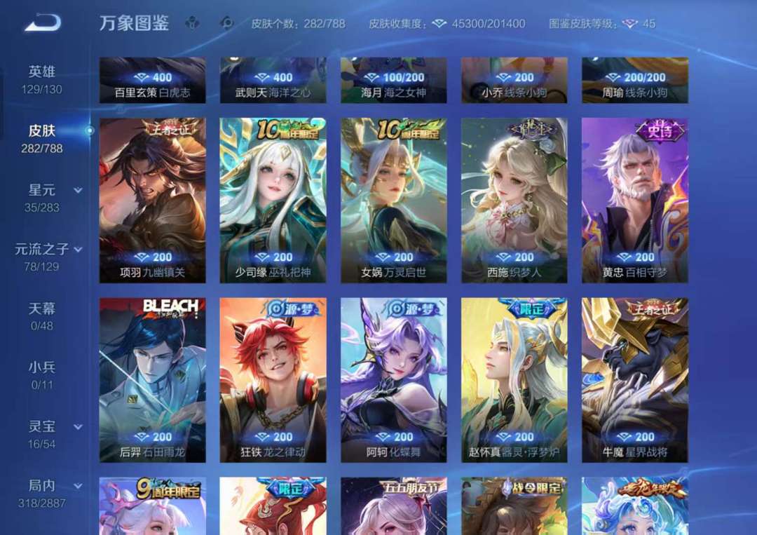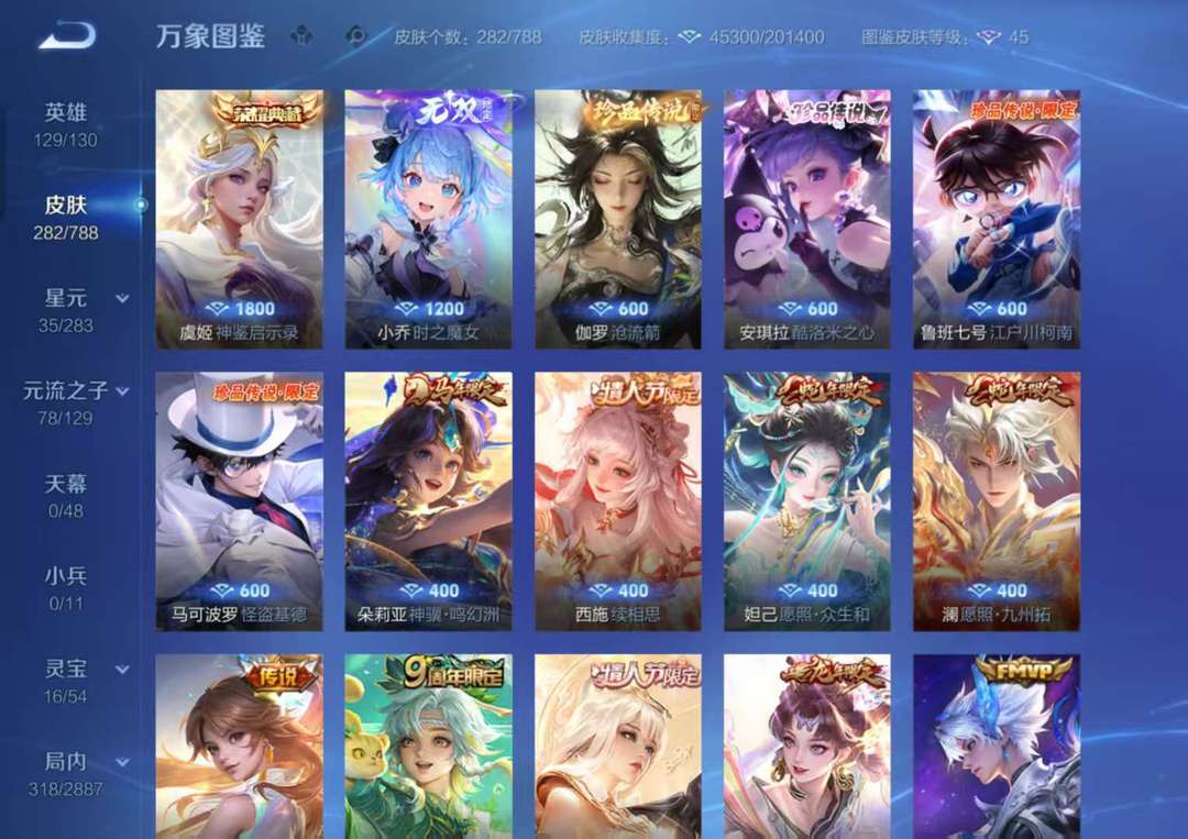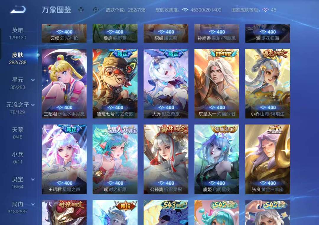 282个皮肤,一典藏一无双,王昭君水手月亮,大乔时之奇旅